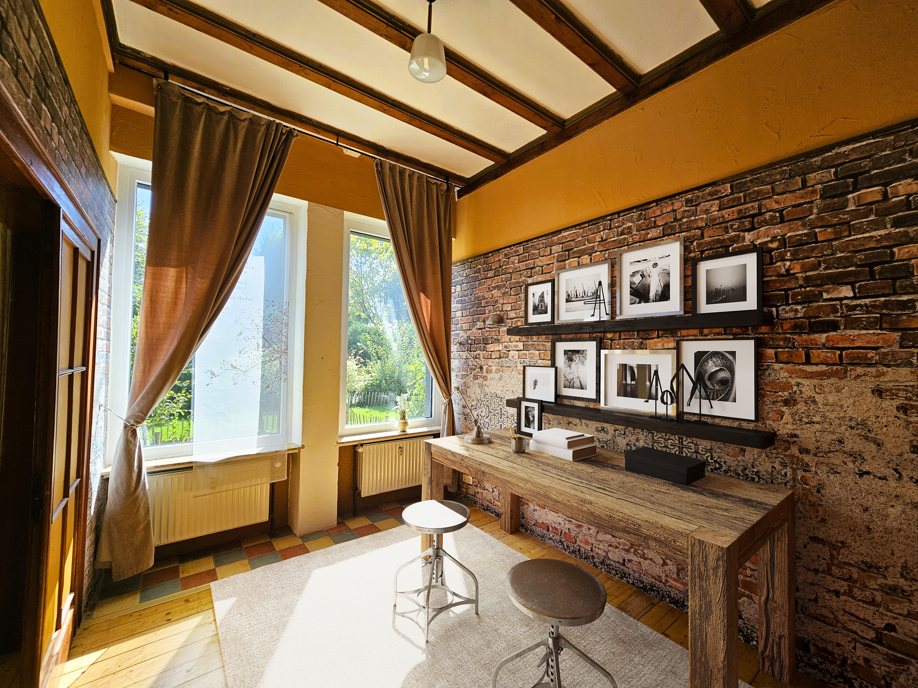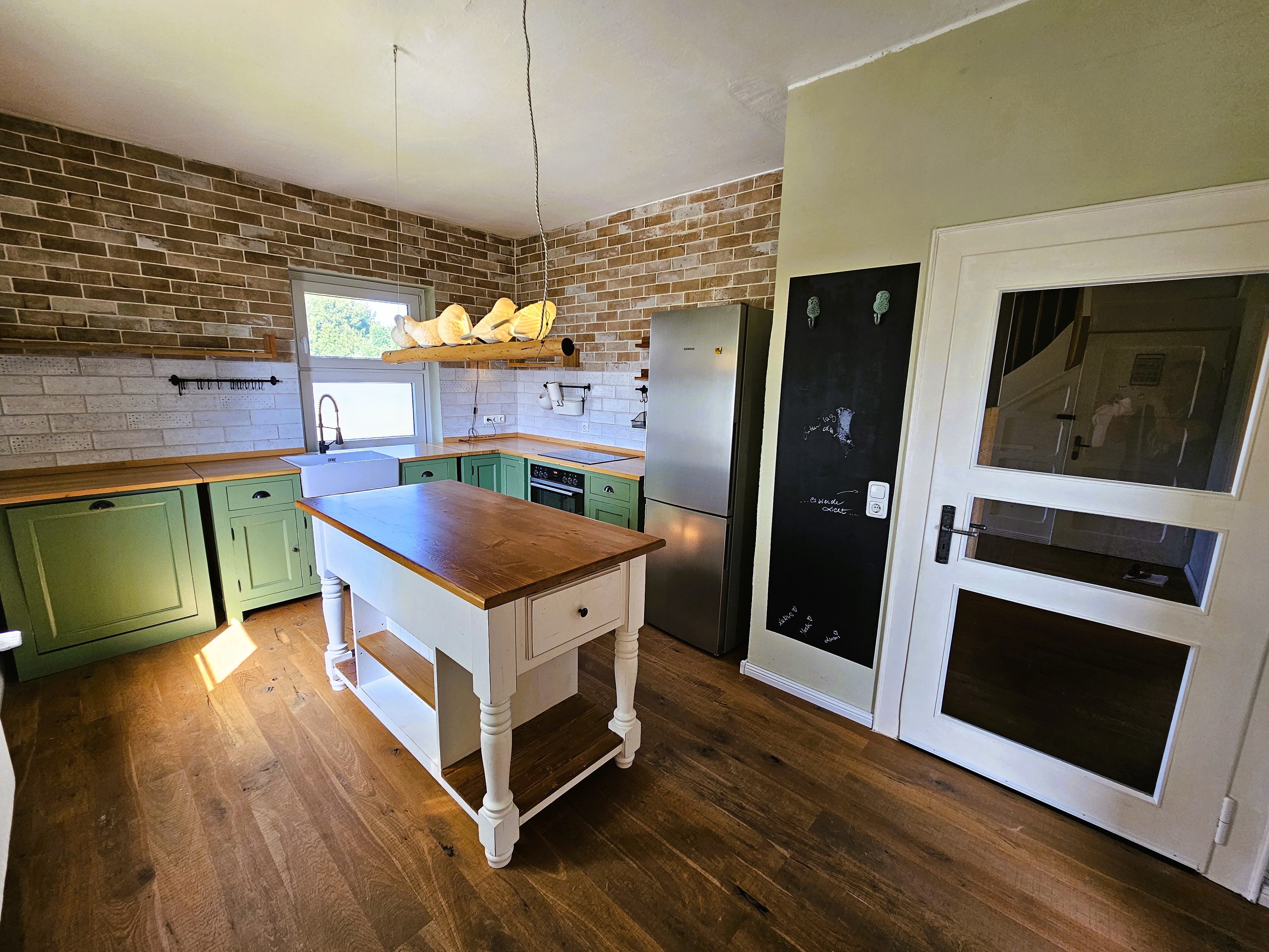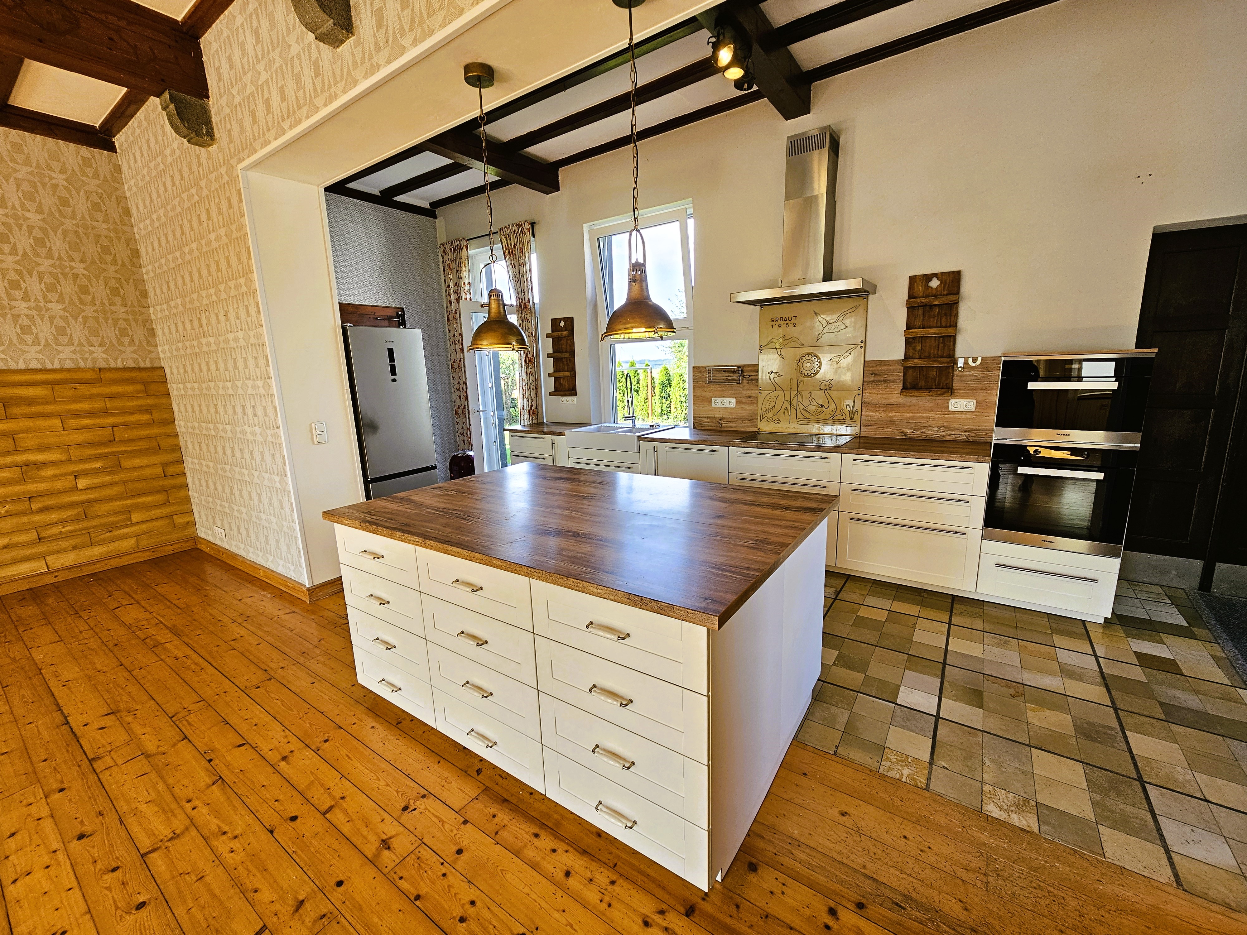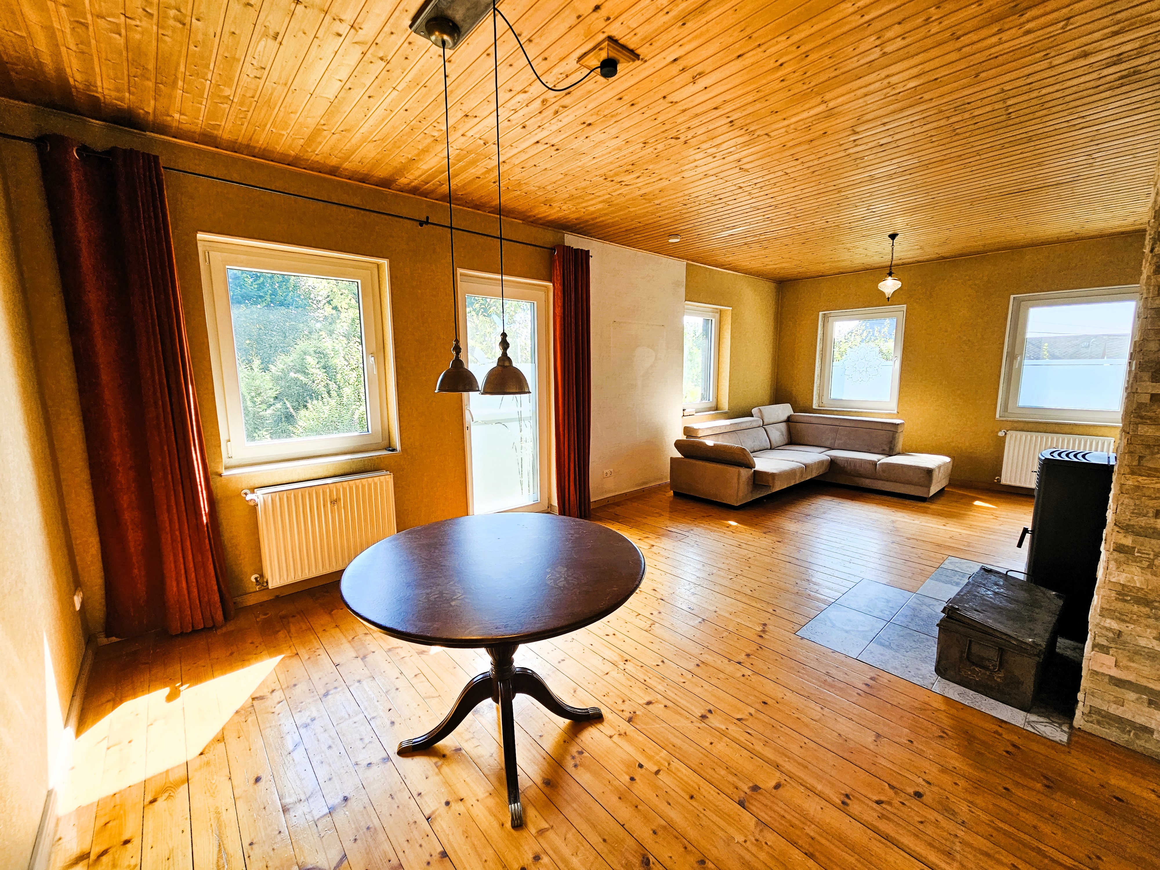 ehemaligen Schulsaal. Dieser beeindruckt durch seine markante Sichtbalkendecke, dem ursprünglichen Dielenboden und den zahlreichen Fensterflächen, die ein ganzjährig lichtdurchflutetes Wohnen ermöglichen. Ein moderner Pelletofen sorgt in der kalten Jahreszeit für zusätzliche Behaglichkeit. Insgesamt stehen hier ca. 75 m² Wohnfläche zur Verfügung. Der Küchen- und Wohnbereich bietet einen direkten Zugang zur dazugehörigen Terrasse sowie zum vorderen und hinteren Gartenbereich. Angrenzend an den ehemaligen Schulsaal, befindet sich ein kleineres Zimmer, welches sich gut als Rückzugsort in Form eines Büros oder TV-Bereichs nutzen lässt.