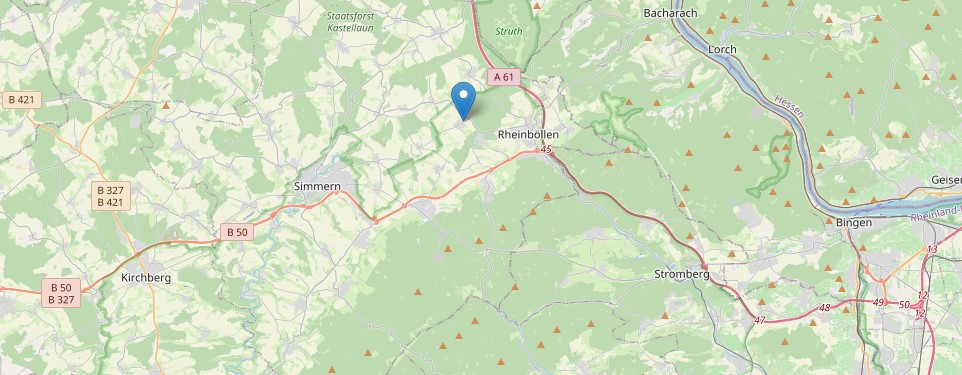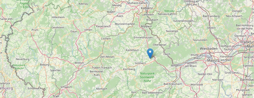 Die Kleinstadt Rheinböllen ist mit knapp 4.100 Einwohnern eine Ortsgemeinde im Rhein-Hunsrück-Kreis in Rheinland-Pfalz. Sie ist eine der beiden Verwaltungssitze der Verbandsgemeinde Simmern-Rheinböllen. Mit der zentralen Lage auf den "Hunsrückhöhen" zwischen Mosel, Nahe, Saar und Rhein, ist sie ebenfalls touristisch interessant. Mörschbach liegt etwa 3,5 km vom Ortskern in Rheinböllen entfernt - genau hier befindet sich die Immobilie.