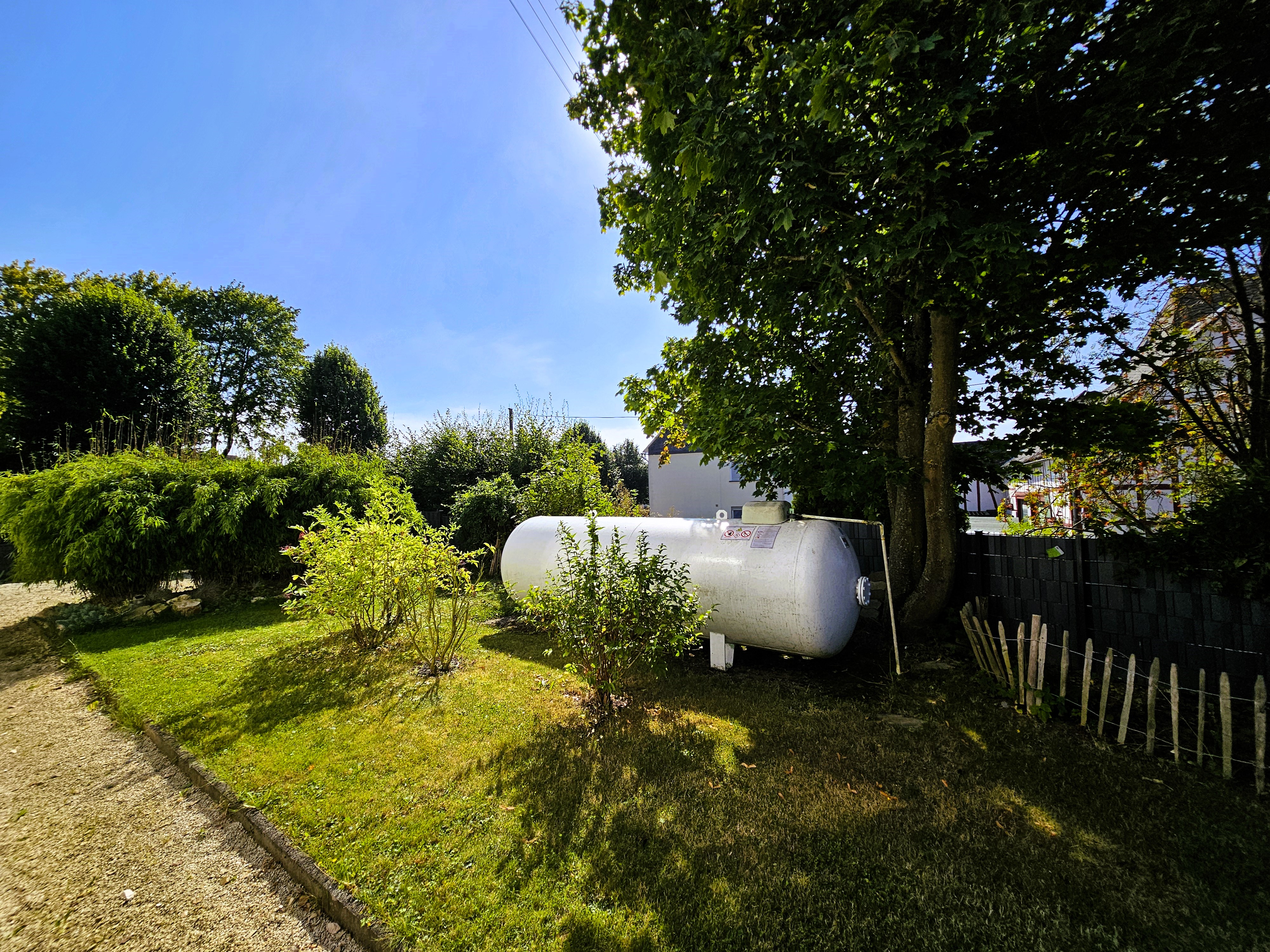 Somit können Sie bei schönem Wetter beinahe ganztägig in der Sonne sitzen, die Natur genießen oder sich der Gartenarbeit widmen. Seitlich des Hauses befindet sich der Gastank (Eigentum).