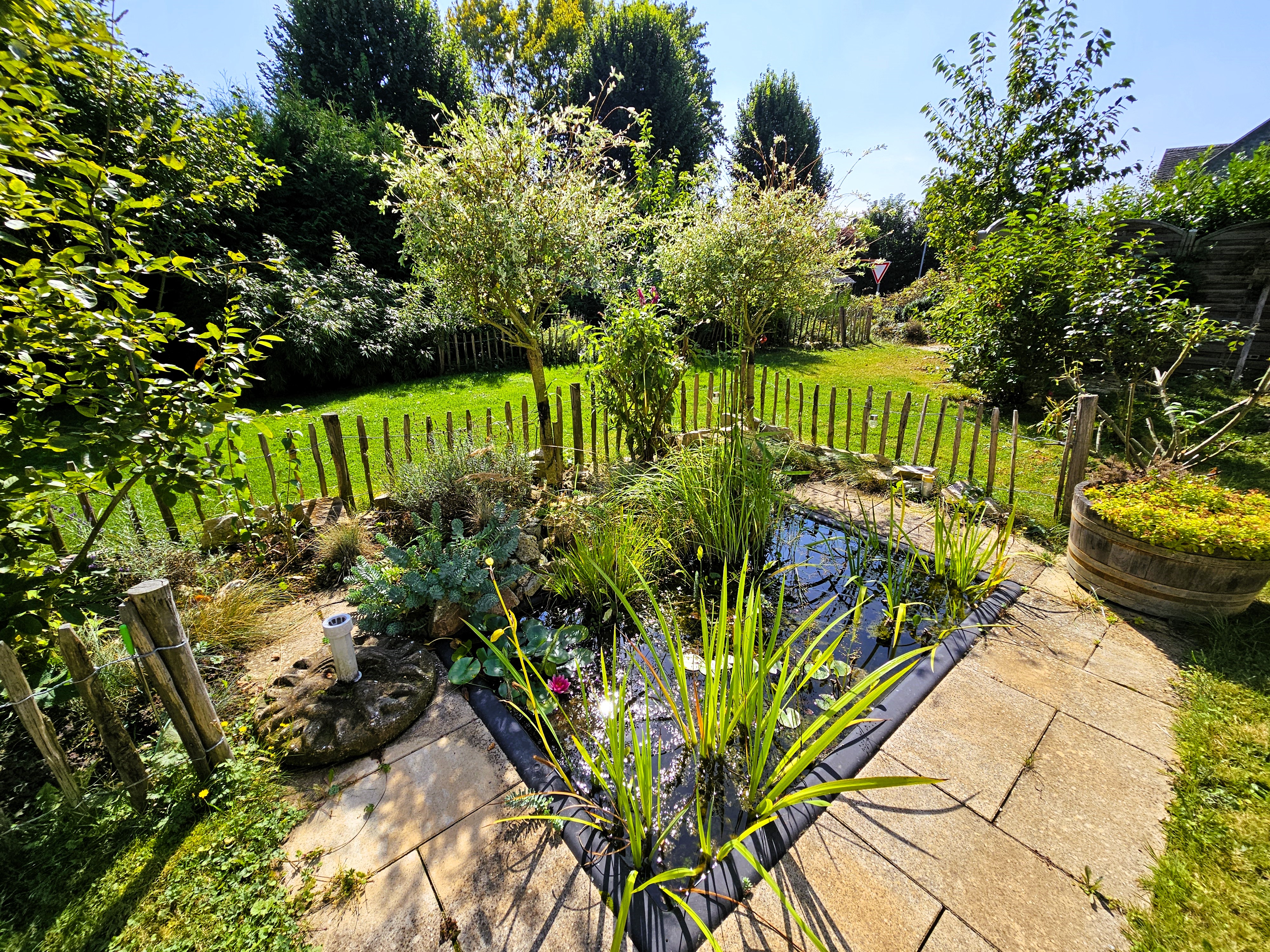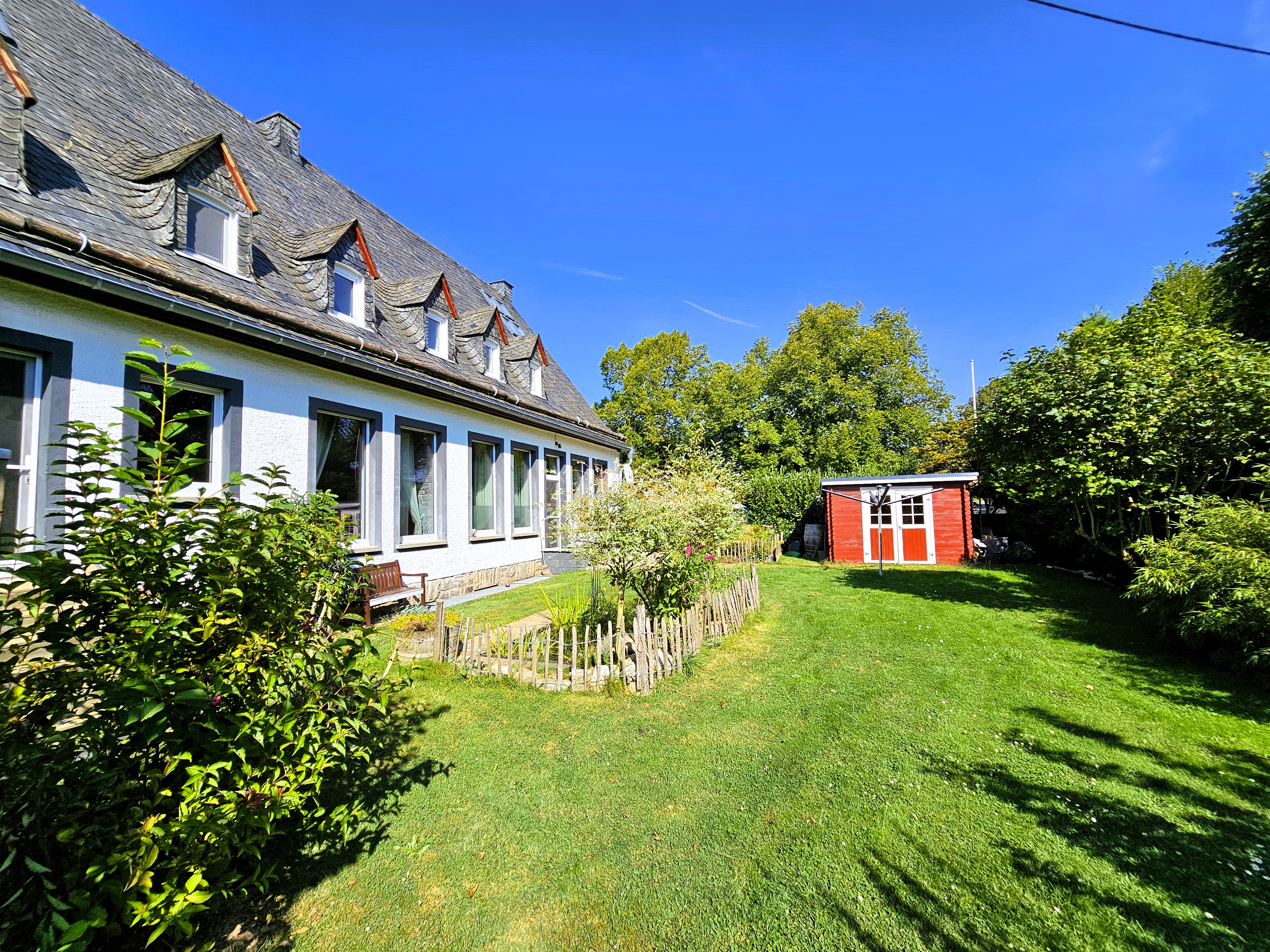 Der komplette Gartenbereich ist aufgrund seiner Gestaltung, von der Straße schwer bis gar nicht einsehbar. Er bietet den Bewohnern des Hauses, egal ob Mensch oder Tier, Ruhe und Erholung. Auf der Vorderseite in Südausrichtung befindet sich eine kleine geflieste Terrasse, ein Gartenteich und ein Gartenhaus. Auf der Rückseite eine