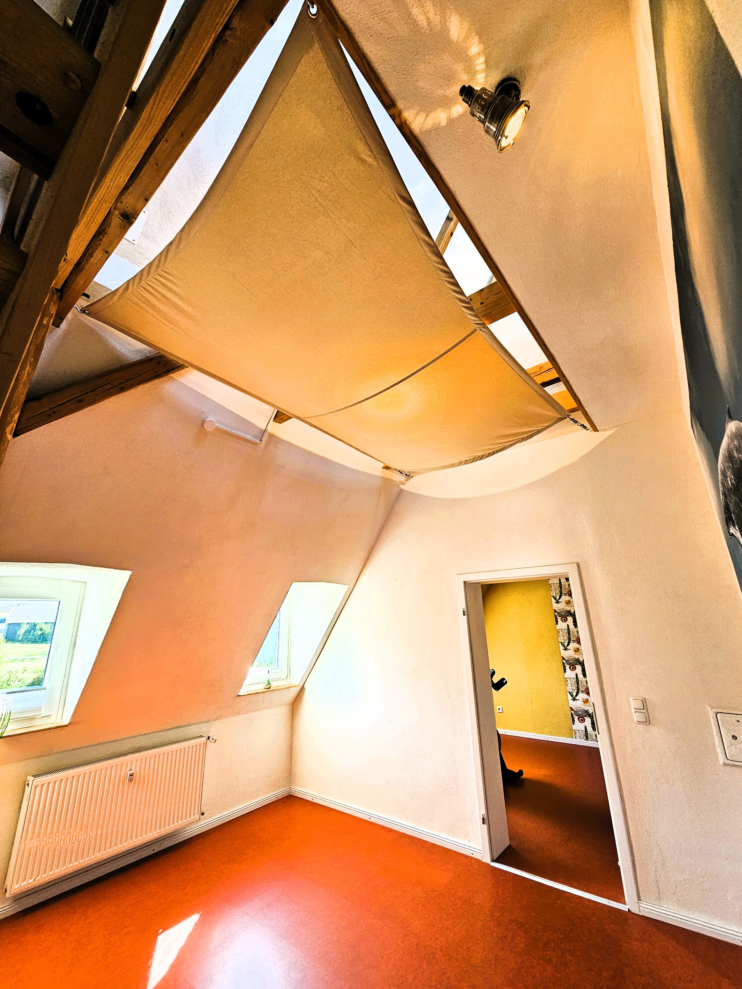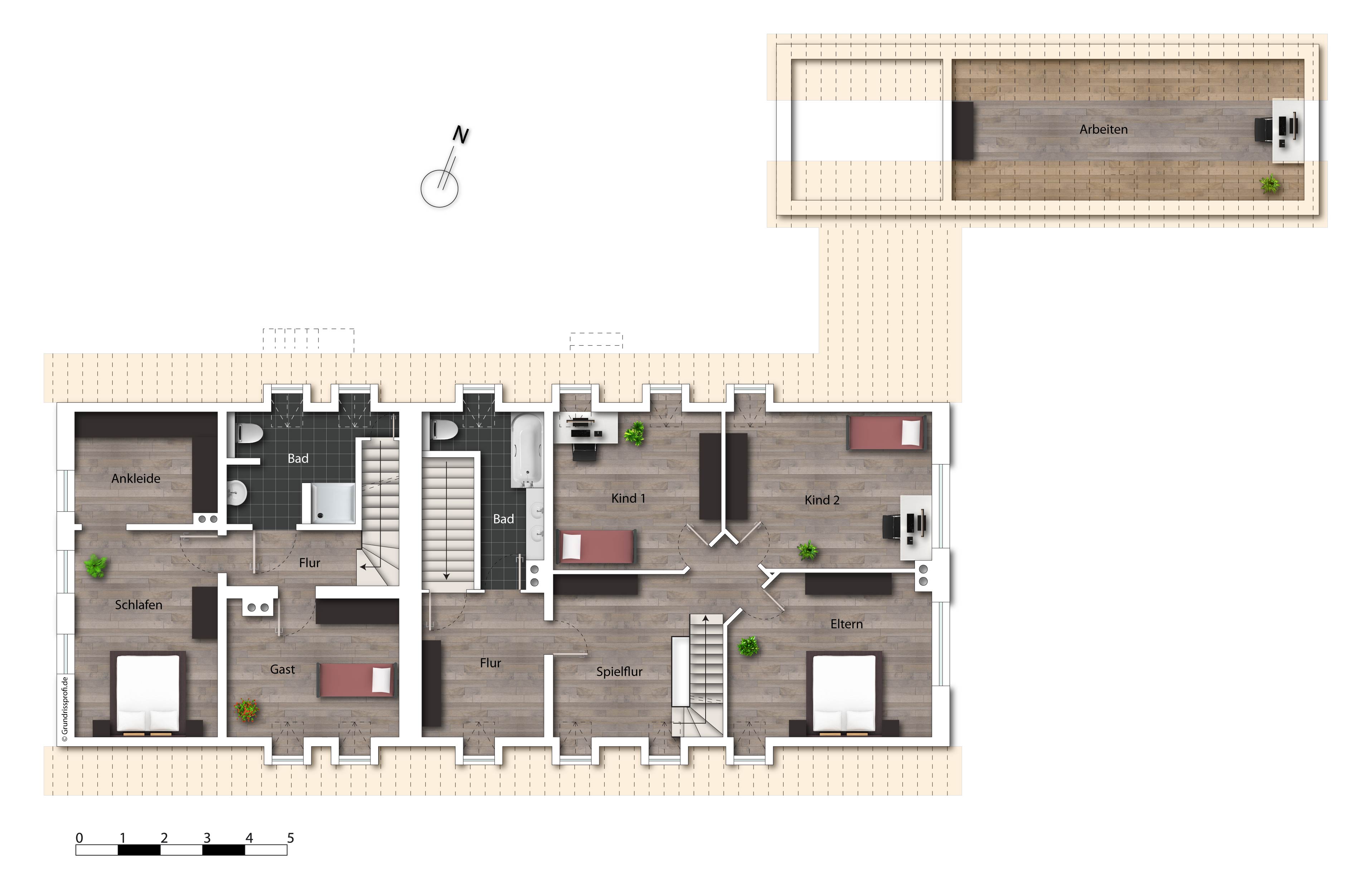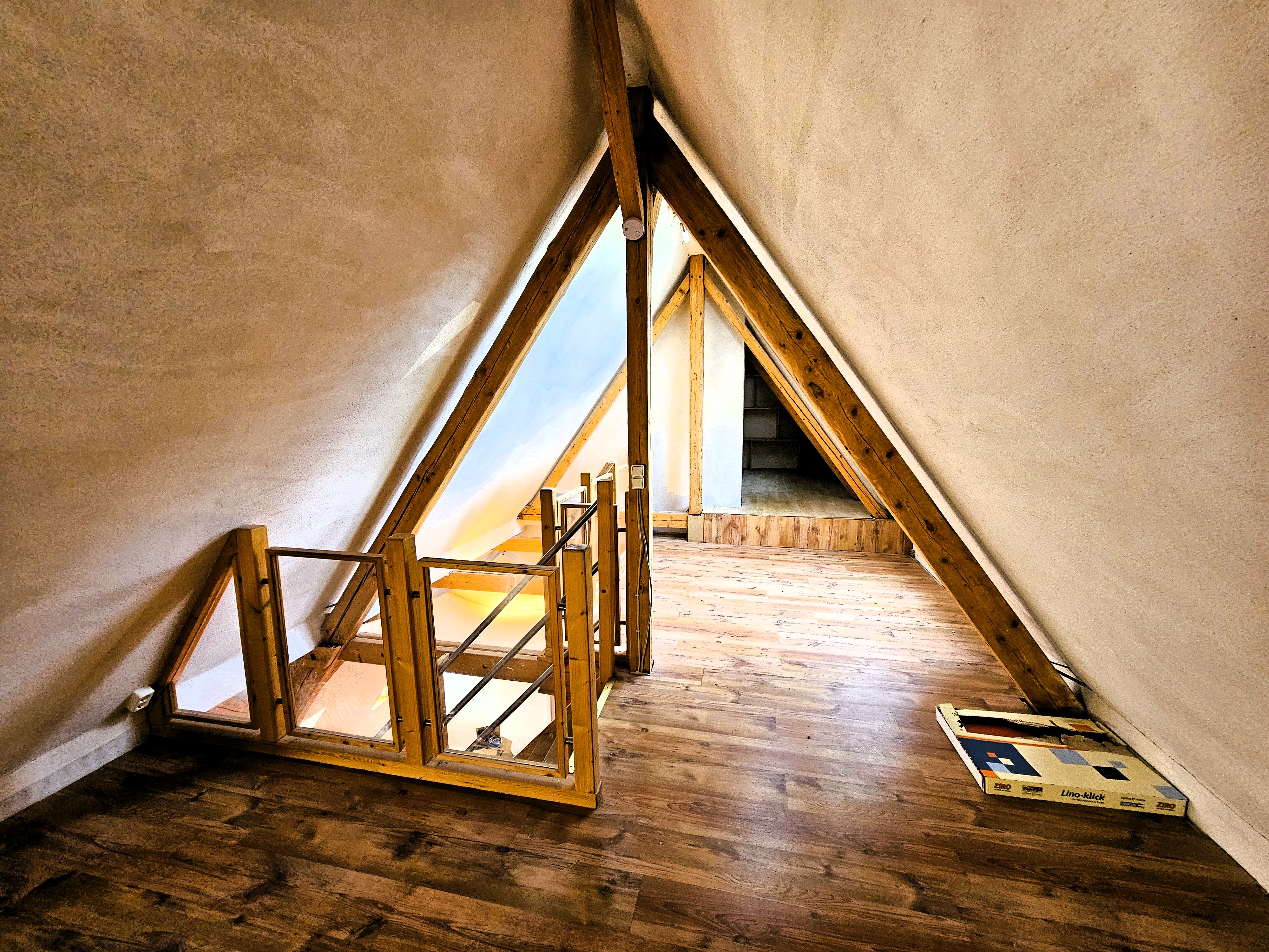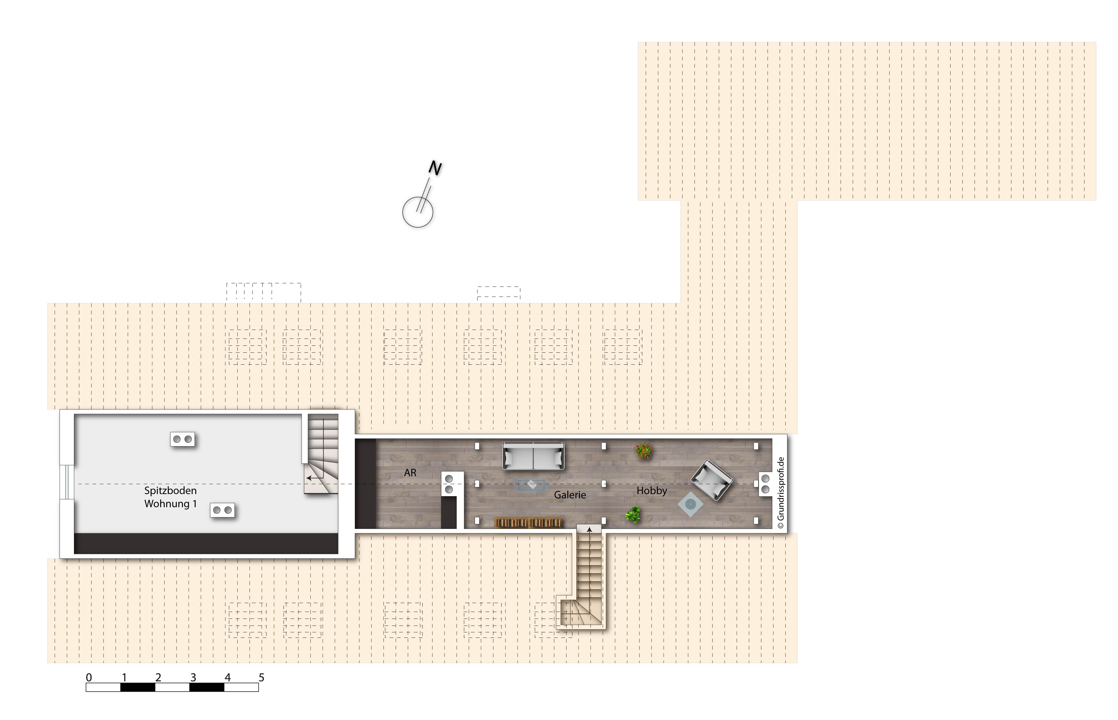 Des Weiteren befindet sich im benachbarten, offenen Treppenhaus der Zugang ins Untergeschoss (vollunterkellerte Immobilie, bis auf Anbau Praxis) sowie ins Dachgeschoss mit seinen drei Schlafzimmern und Bad mit Badewann und Duschwand. Zudem gibt es hier einen Spielflur und die weiterführende Treppe in den Spitzboden, geprägt von einem sehr offenen gestalteten Raumkonzept. Hier werden Sie auf eine Art offene Galerie geführt, in der sich ein weitreichender Hobbybereich sowie ein Abstellbereich befinden.