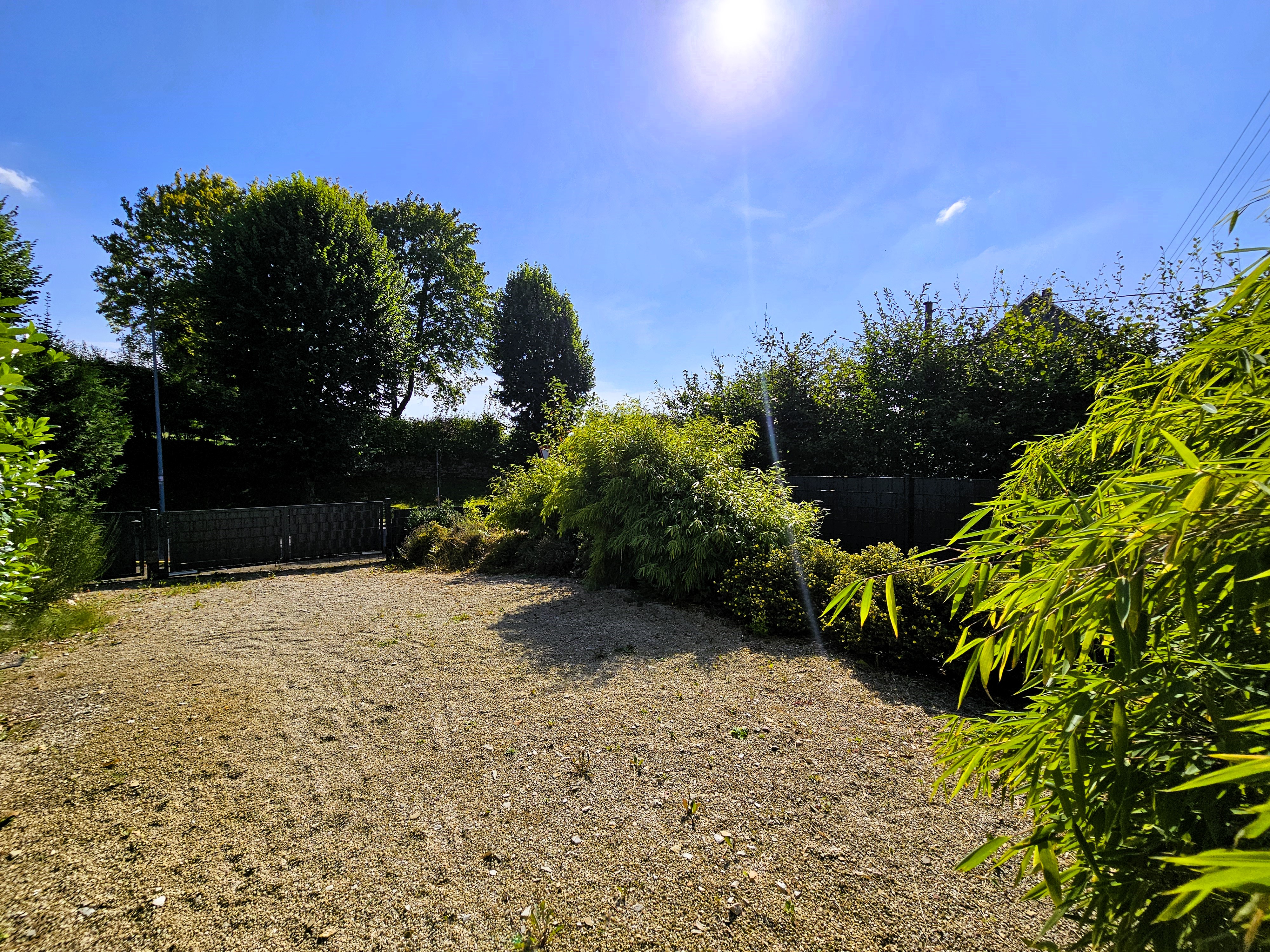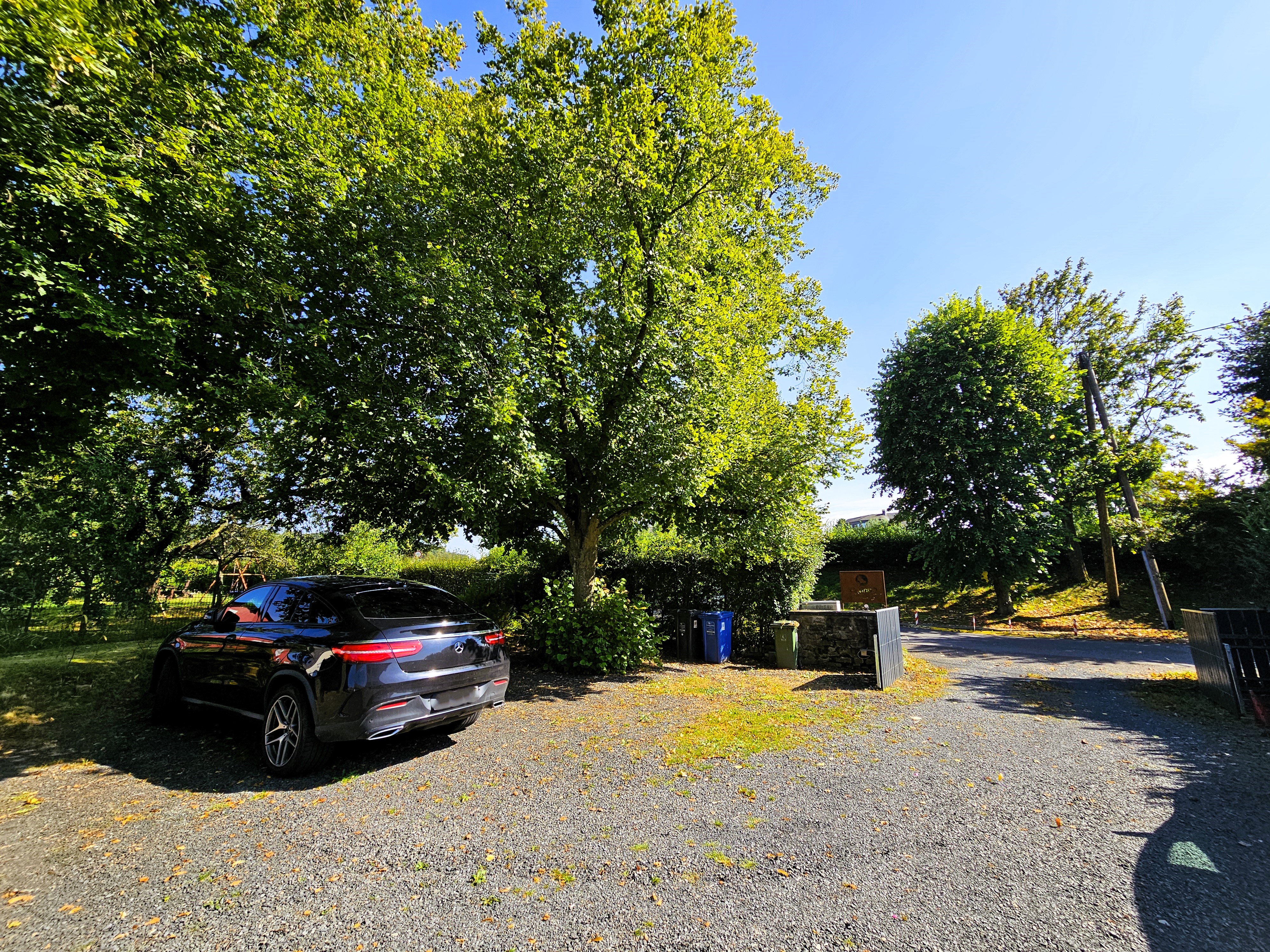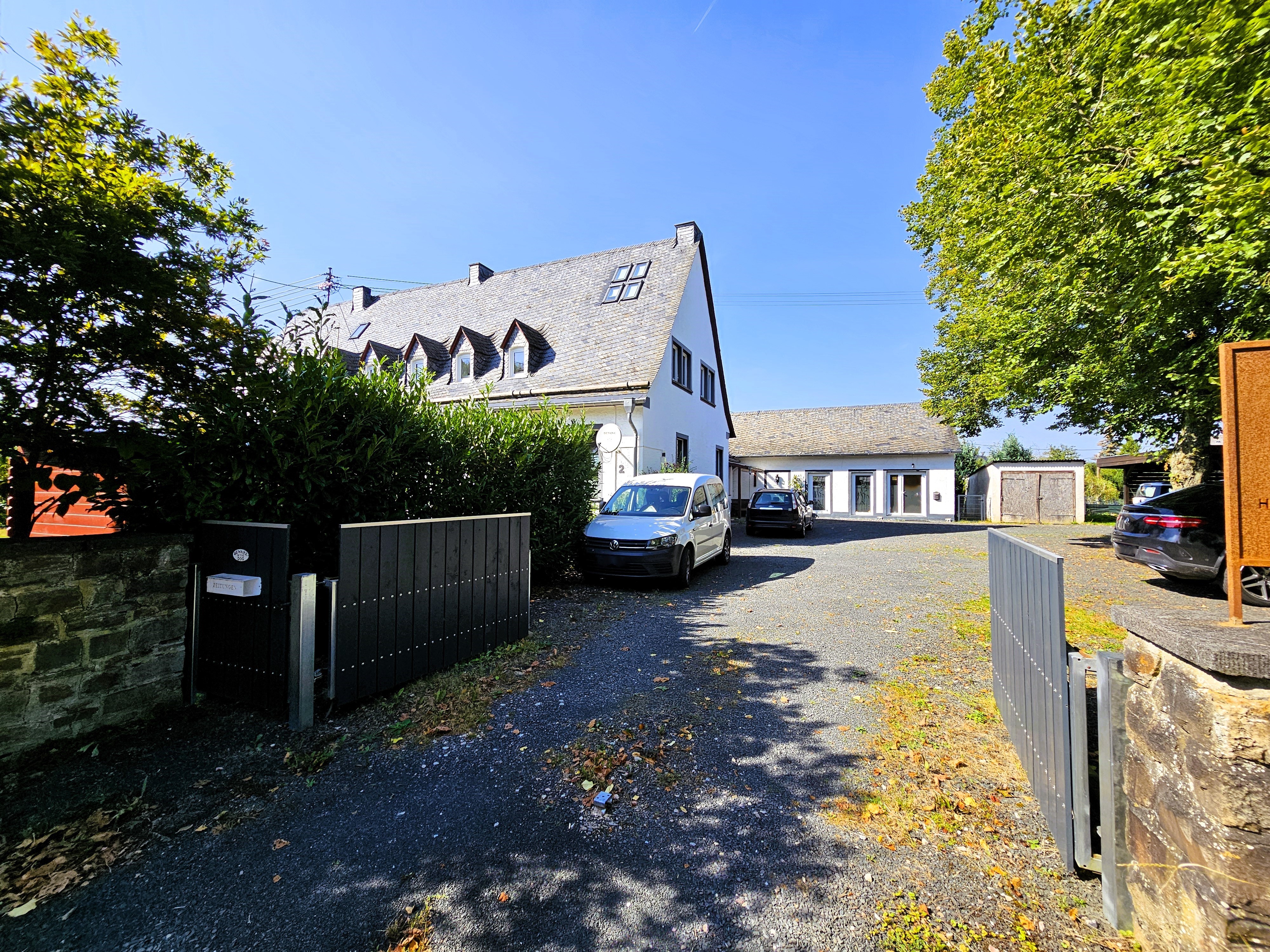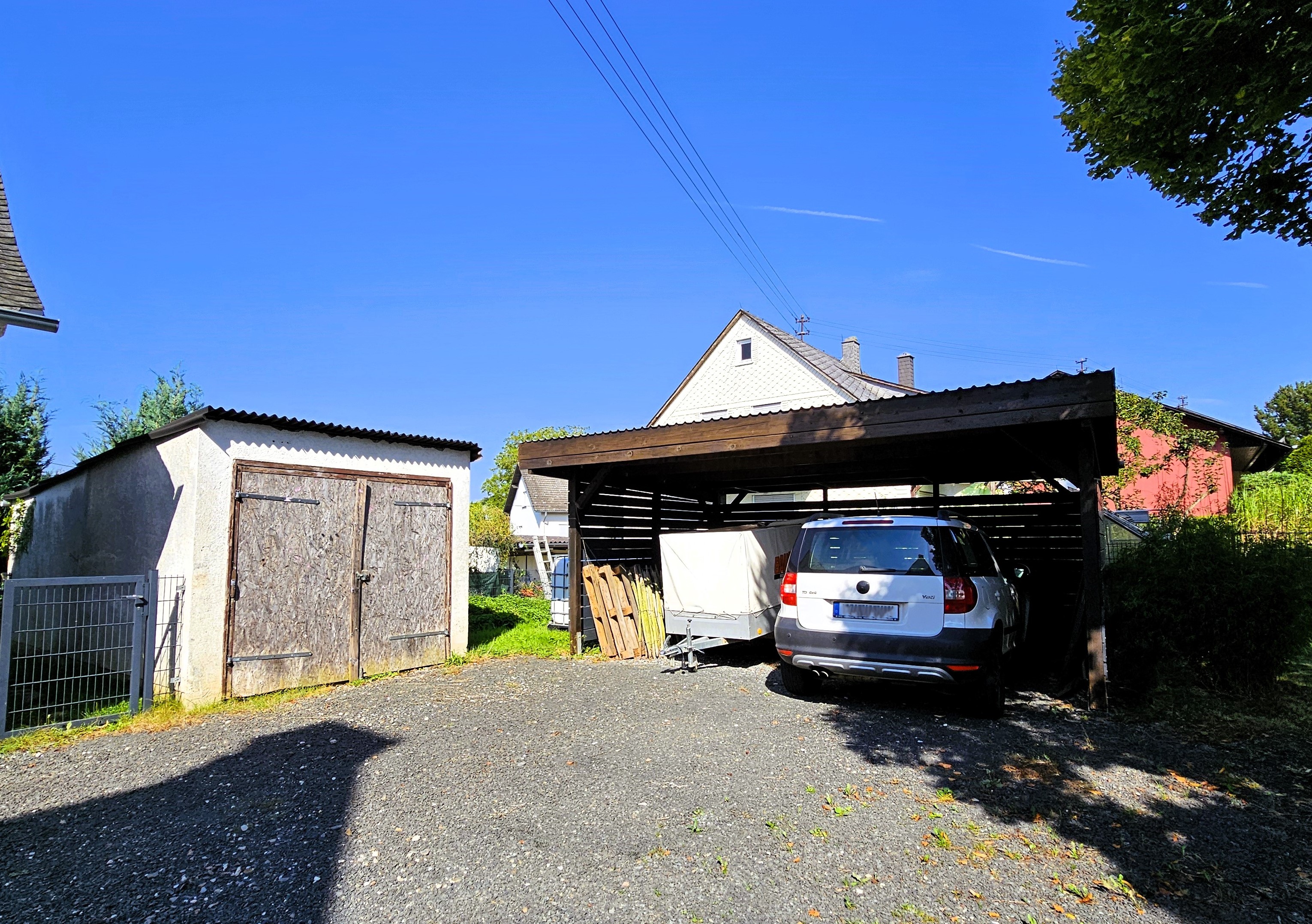 Über die kiesbelegte Zufahrt, seitlich des Hauses, gelangen Sie zu Garage, Carport und den Stellplätzen.