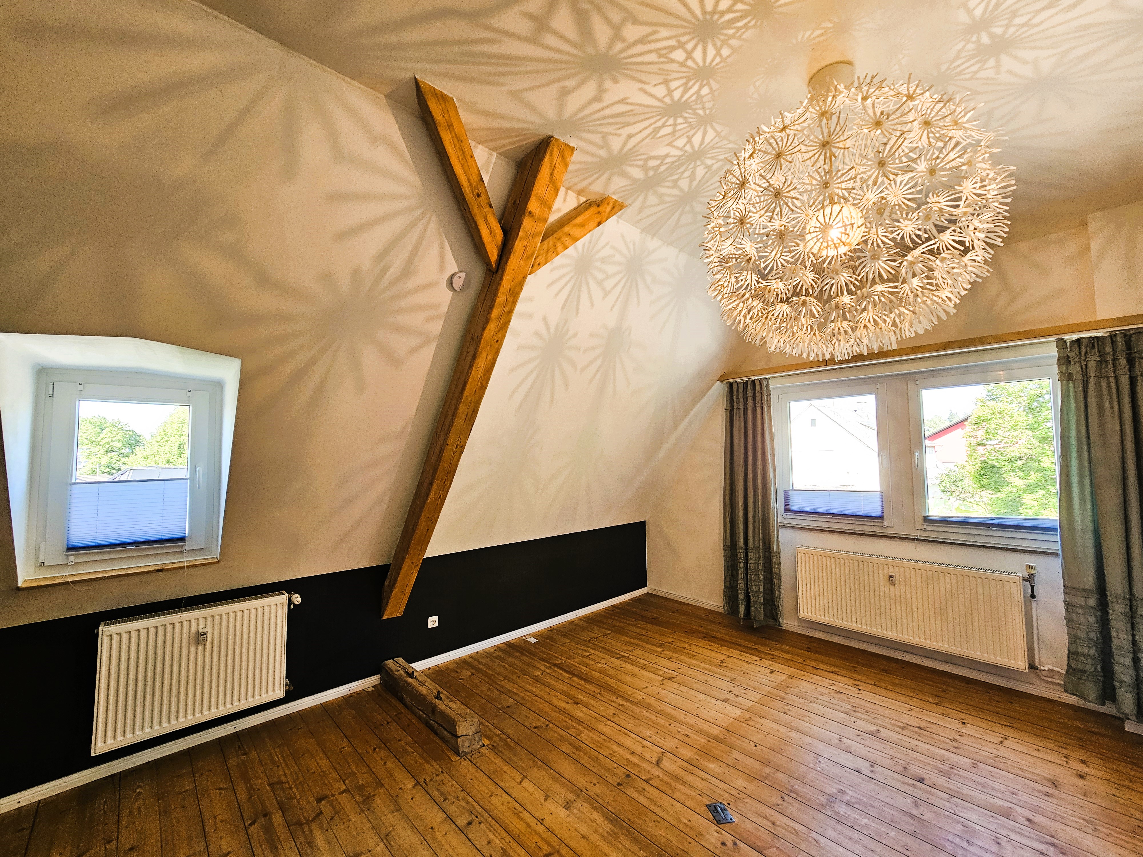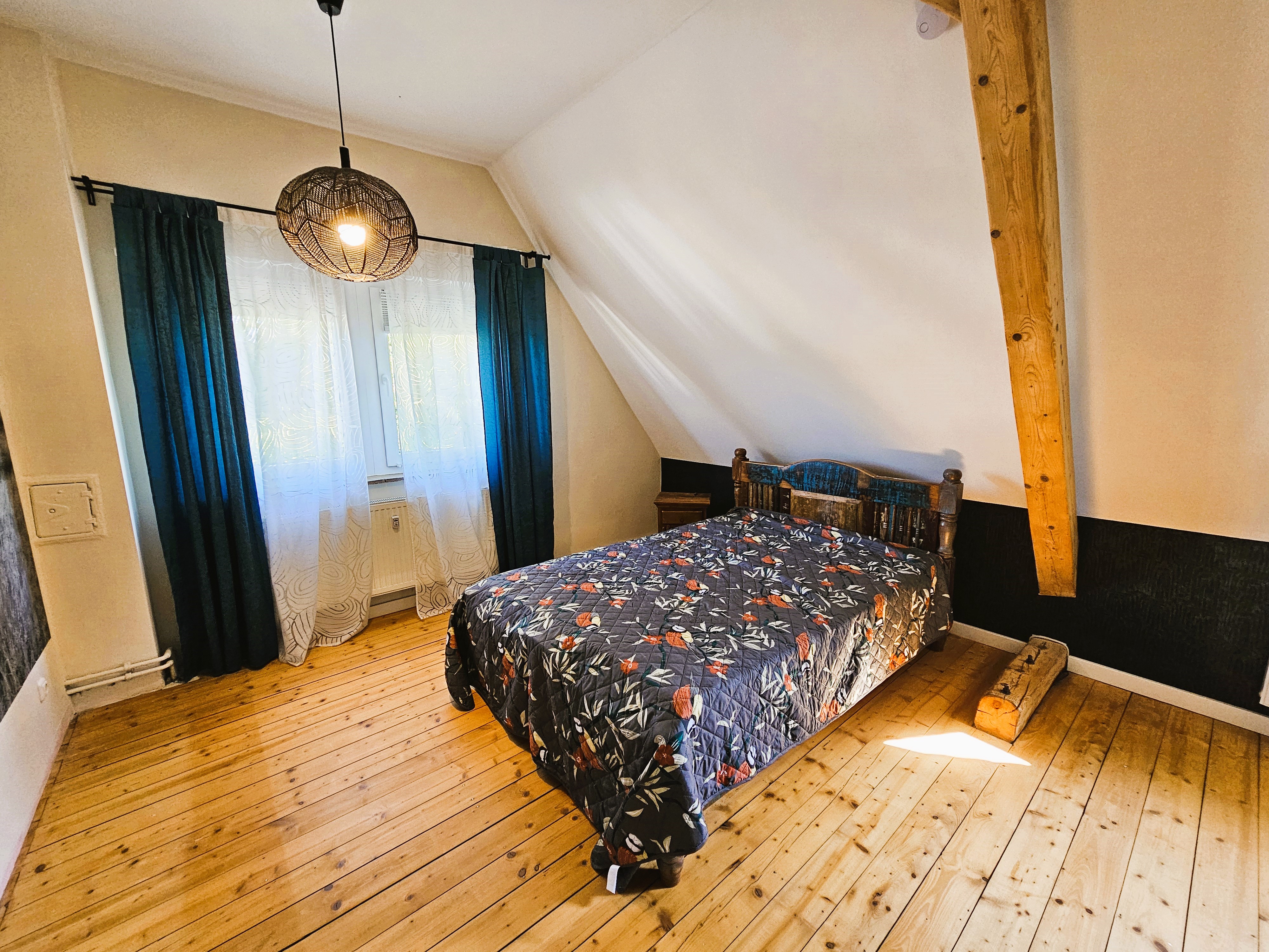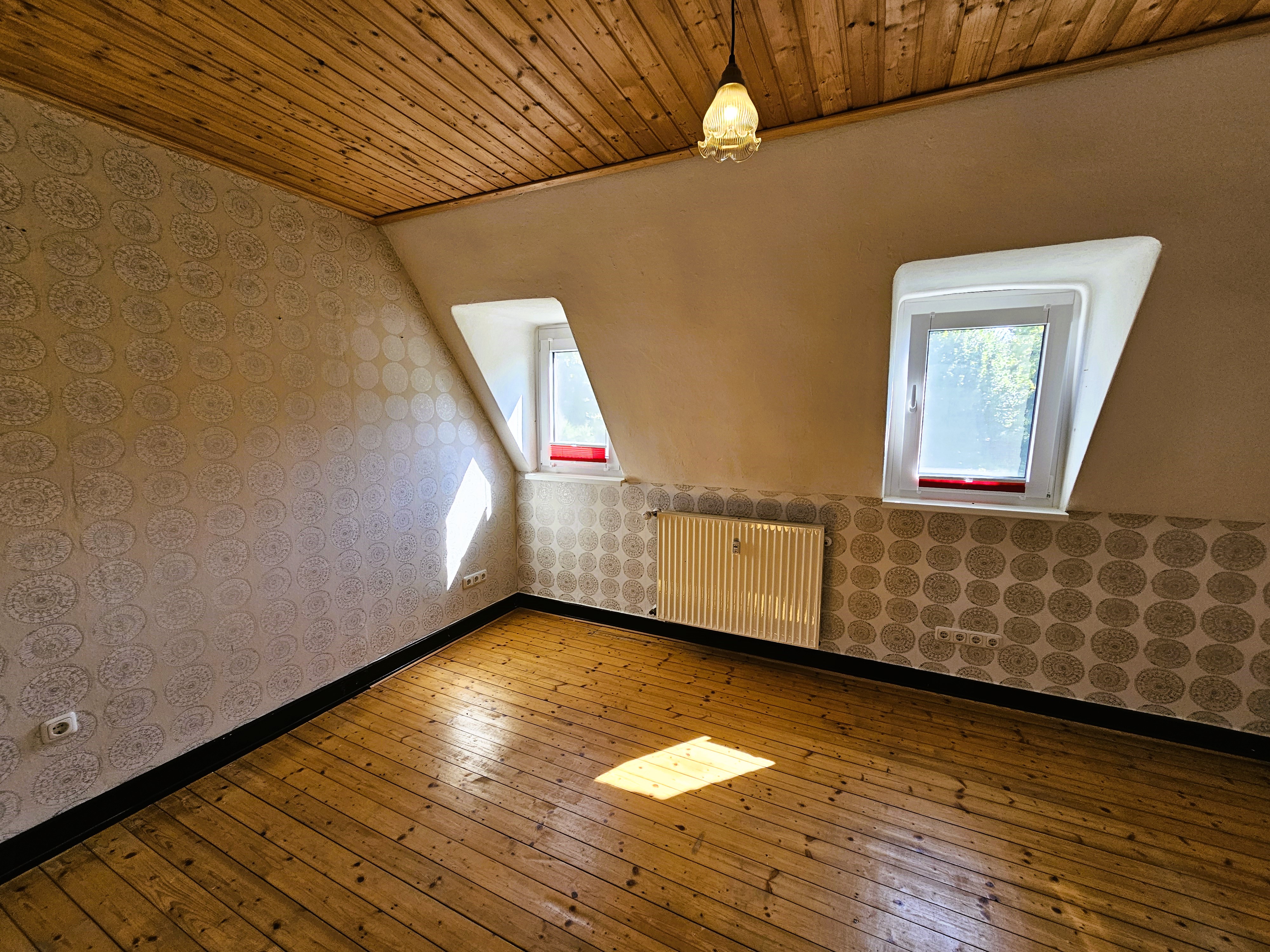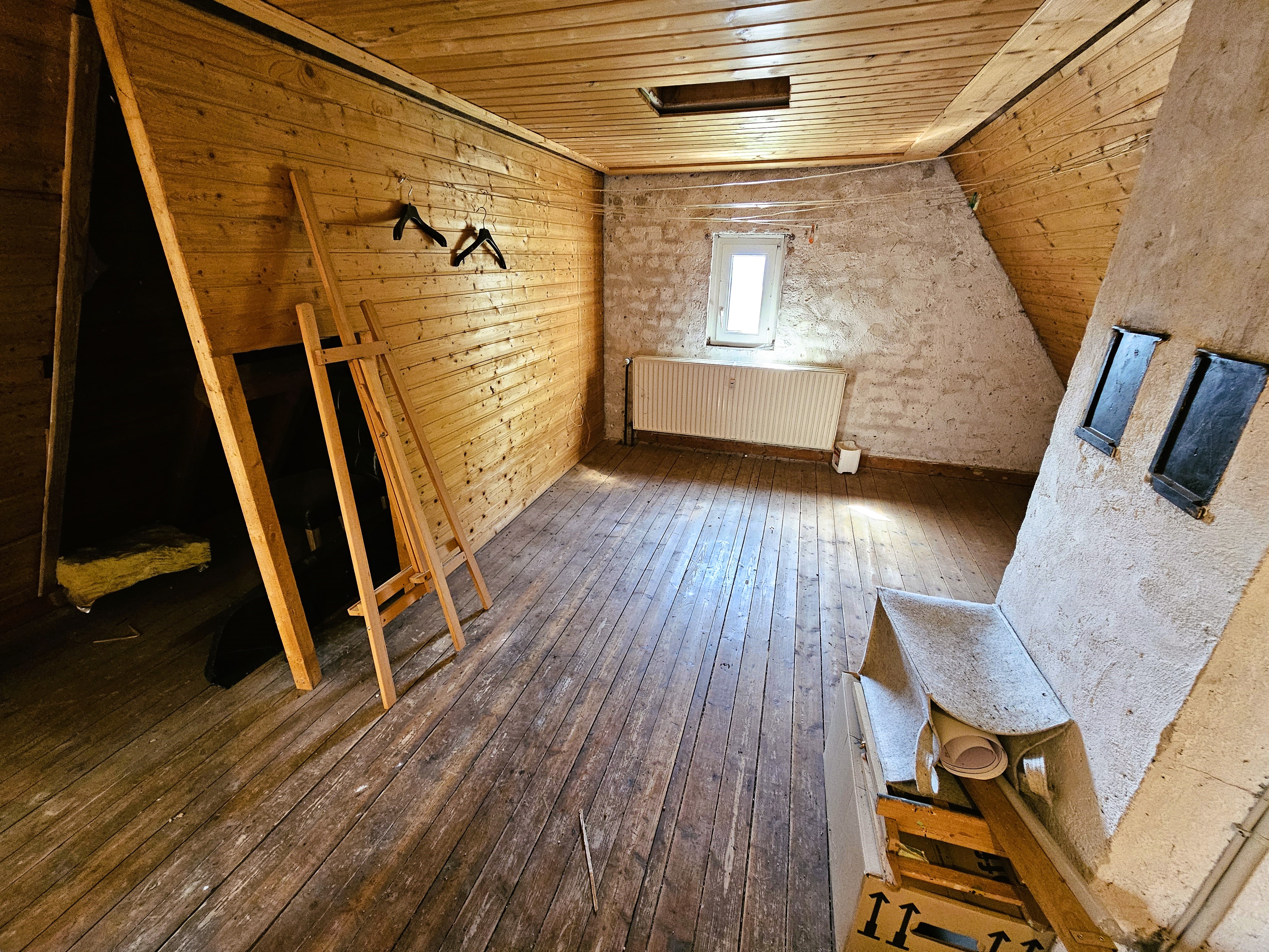 Die Wohnung verfügt über zwei separate Eingänge: den Haupteingang - auf der Rückseite des Hauses gelegen und den Nebeneingang, vom Parkplatz und Garten her zu erschließen. Über eine kleine Außentreppe und einen Windfang, der als ehemalige Lehrerwohnung auch den Zugang zum ehemaligen Schulhaus darstellen kann, erreicht man die sich im Erdgeschoss befindlichen Räumlichkeiten: Küche mit moderner Einbauküche im Landhausstil, Wohn- und Esszimmer mit dem WLAN-fähigen Pelletofen, welcher auch in der kälteren Jahreszeit Wärme und Behaglichkeit spendet und dem damit verbundenen Gartenzugang. Die zahlreichen Fenster sorgen für eine hell, lichtdurchflutete Atmosphäre und das Zusammenspiel aus Dielen und Deckenpanellen aus Holz vermitteln hier zusätzlich Gemütlichkeit. Daneben befindet sich ein Badezimmer mit Sauna und Mosaikfliesen aus Natursteinen als Bodenbelag im modernen Stil. Über ein offen gehaltenes Treppenhaus erreicht man die beiden Schlafräume im Dachgeschoss - eines großzügig und mit begehbarem Ankleidezimmer, das andere etwas kleiner, hervorragend geeignet als Kinder-/ Gäste- oder Arbeitszimmer. Auch auf dieser Ebene befindet sich ein Badezimmer, hier allerdings mit begehbarer Dusche und Zugang zum Spitzboden.