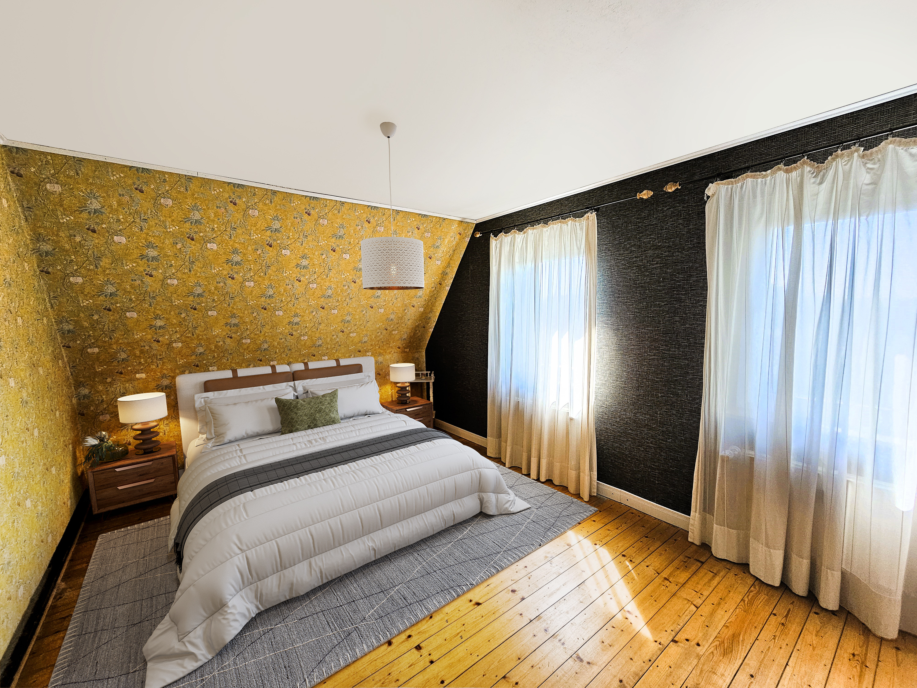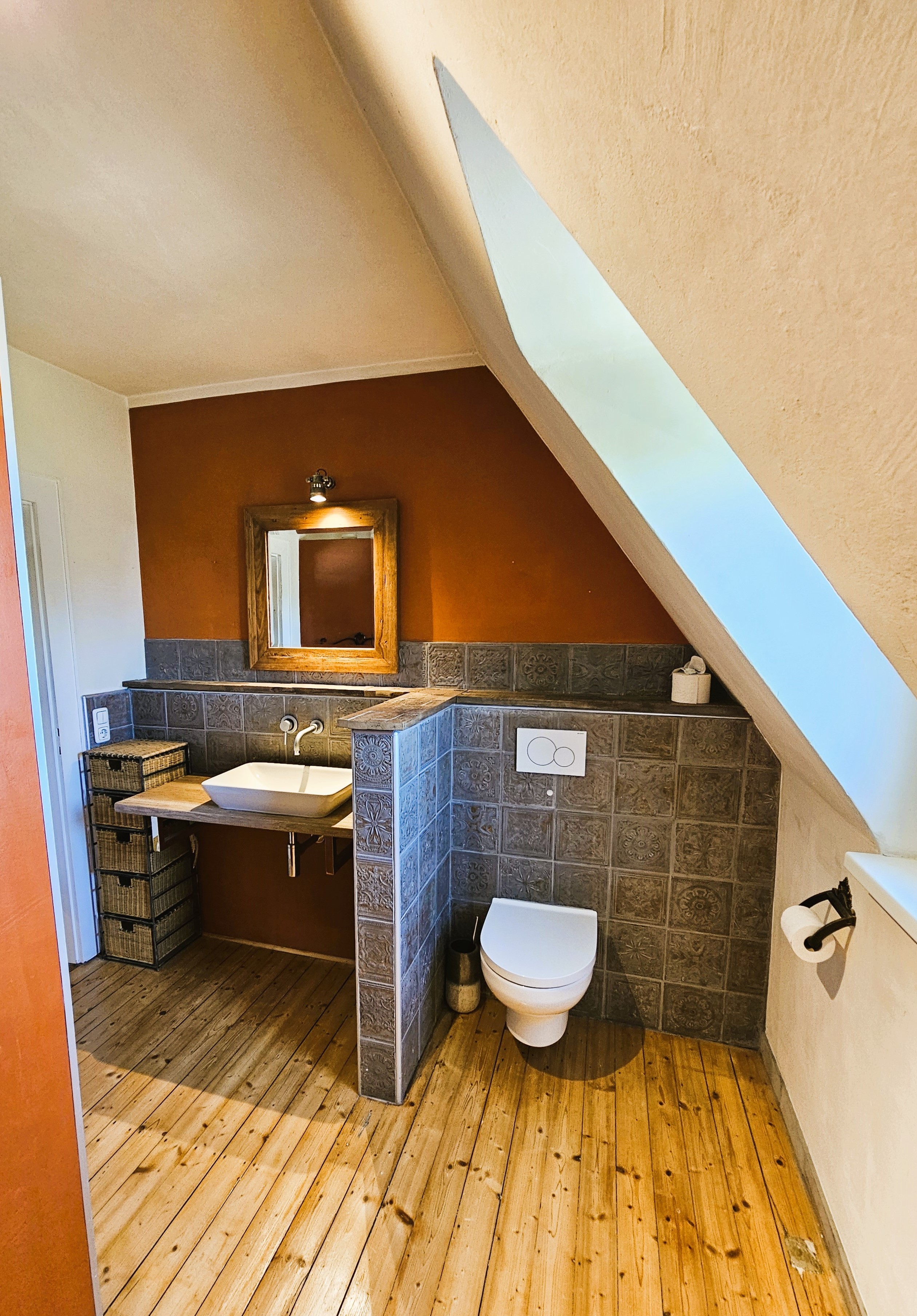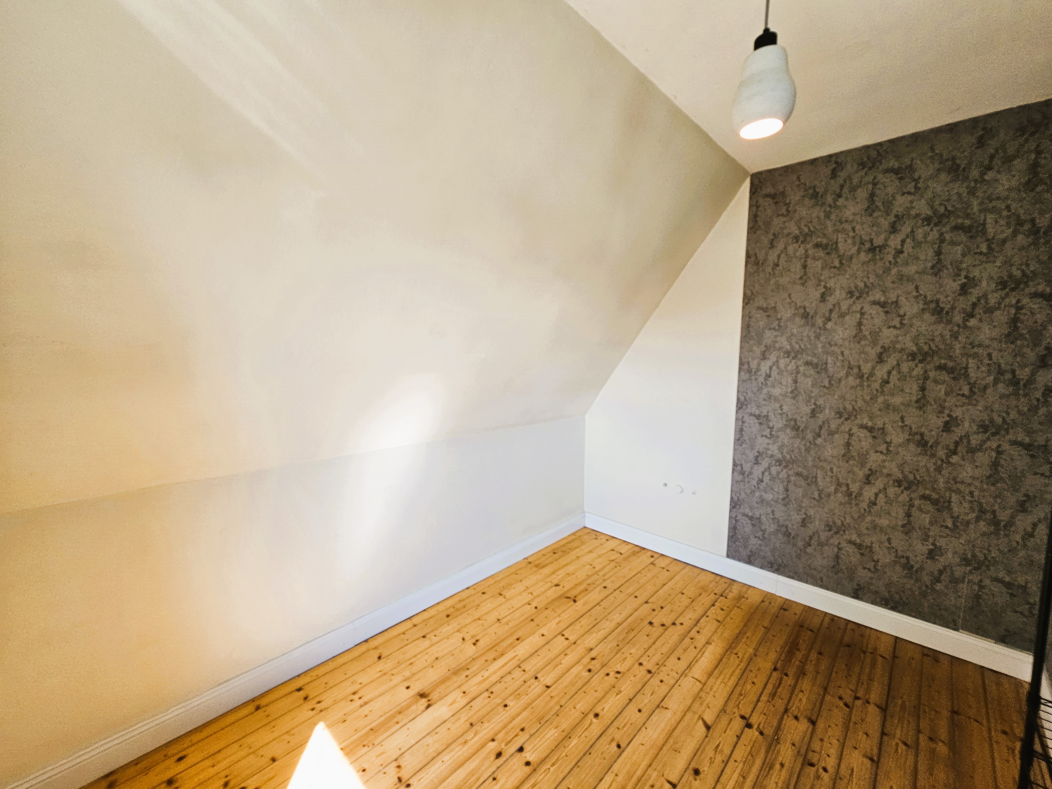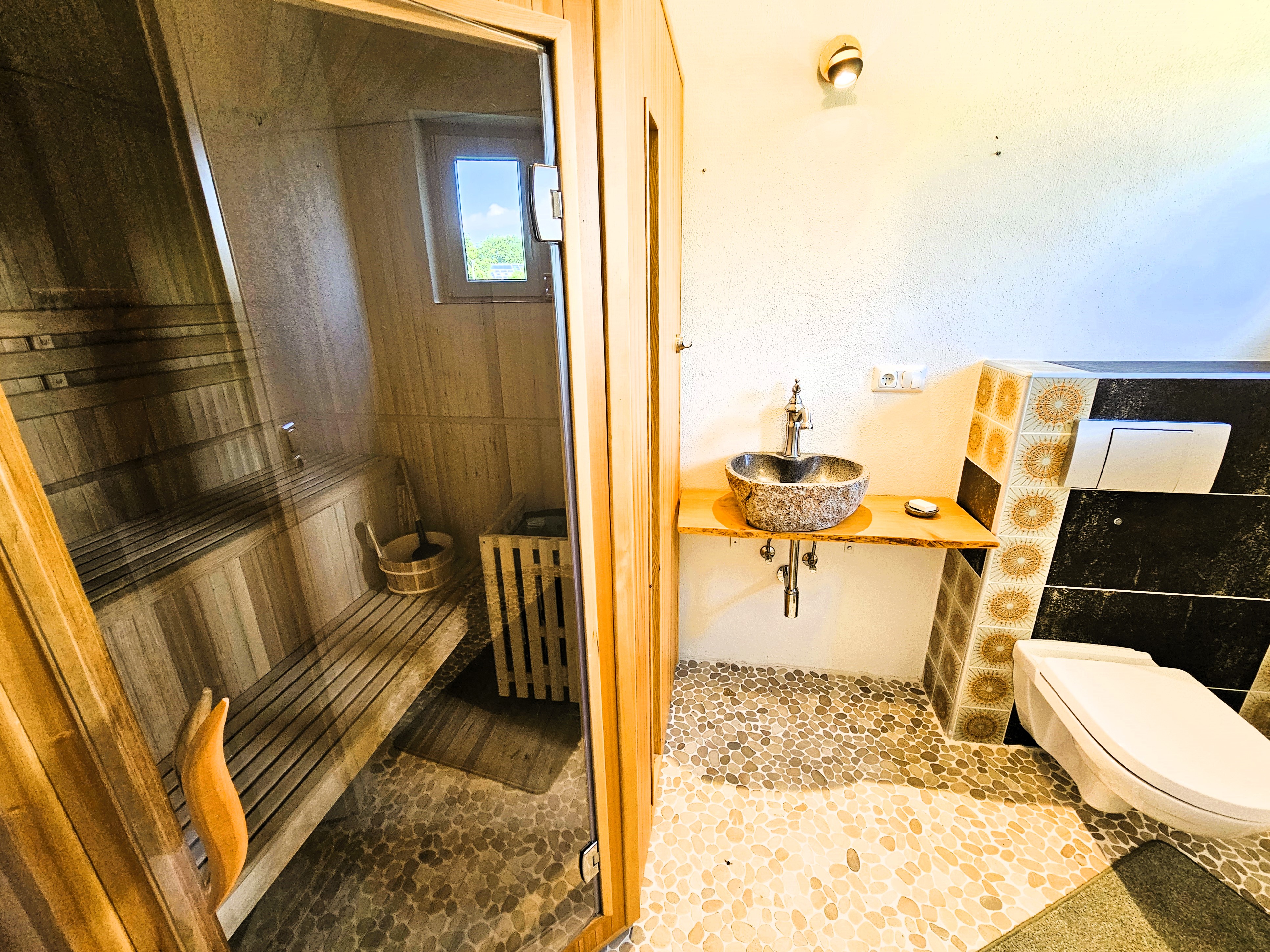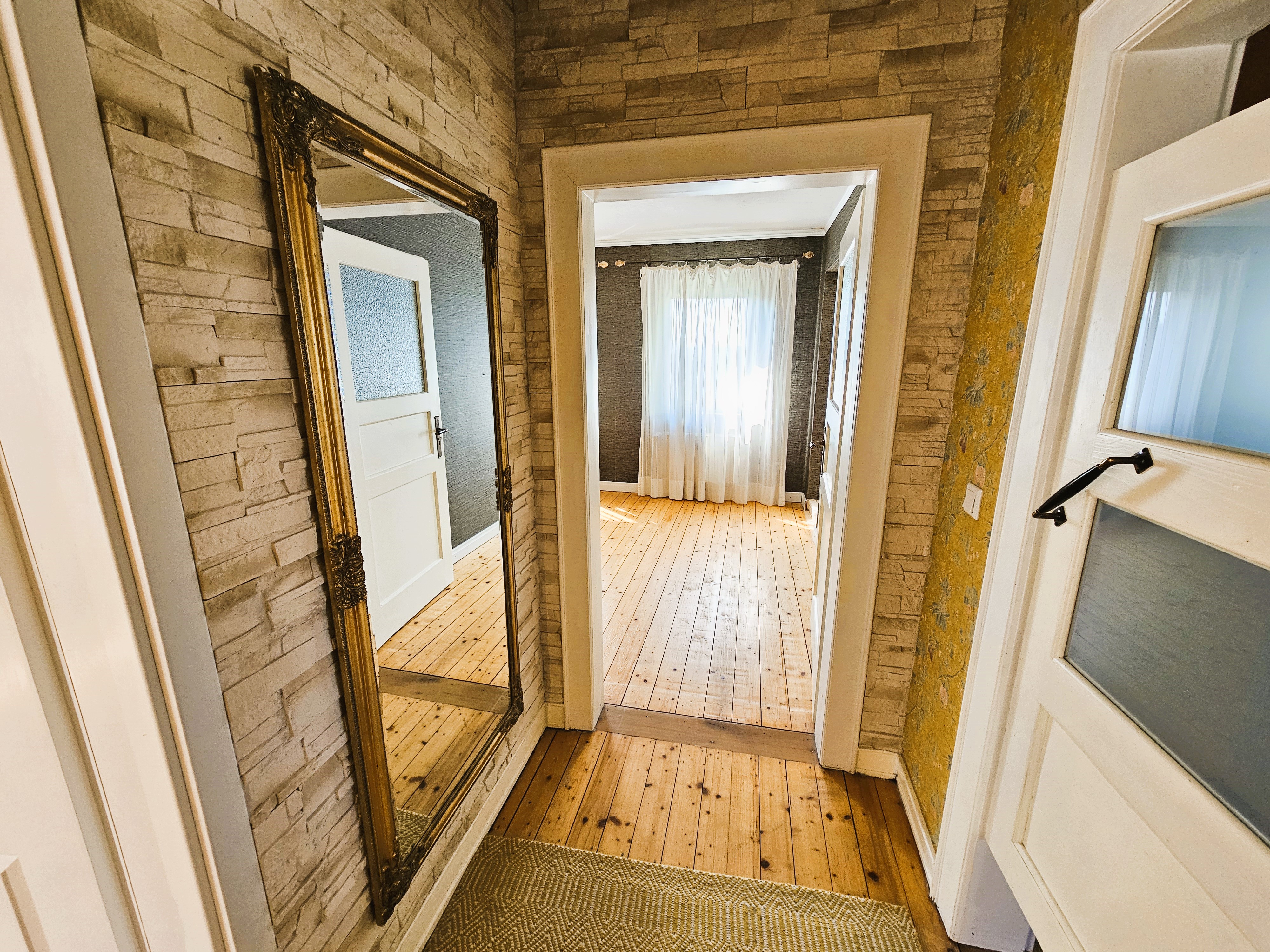 Die Wohnung verfügt über zwei separate Eingänge: den Haupteingang - auf der Rückseite des Hauses gelegen und den Nebeneingang, vom Parkplatz und Garten her zu erschließen. Über eine kleine Außentreppe und einen Windfang, der als ehemalige Lehrerwohnung auch den Zugang zum ehemaligen Schulhaus darstellen kann, erreicht man die sich im Erdgeschoss befindlichen Räumlichkeiten: Küche mit moderner Einbauküche im Landhausstil, Wohn- und Esszimmer mit dem WLAN-fähigen Pelletofen, welcher auch in der kälteren Jahreszeit Wärme und Behaglichkeit spendet und dem damit verbundenen Gartenzugang. Die zahlreichen Fenster sorgen für eine hell, lichtdurchflutete Atmosphäre und das Zusammenspiel aus Dielen und Deckenpanellen aus Holz vermitteln hier zusätzlich Gemütlichkeit. Daneben befindet sich ein Badezimmer mit Sauna und Mosaikfliesen aus Natursteinen als Bodenbelag im modernen Stil. Über ein offen gehaltenes Treppenhaus erreicht man die beiden Schlafräume im Dachgeschoss - eines großzügig und mit begehbarem Ankleidezimmer, das andere etwas kleiner, hervorragend geeignet als Kinder-/ Gäste- oder Arbeitszimmer. Auch auf dieser Ebene befindet sich ein Badezimmer, hier allerdings mit begehbarer Dusche und Zugang zum Spitzboden.