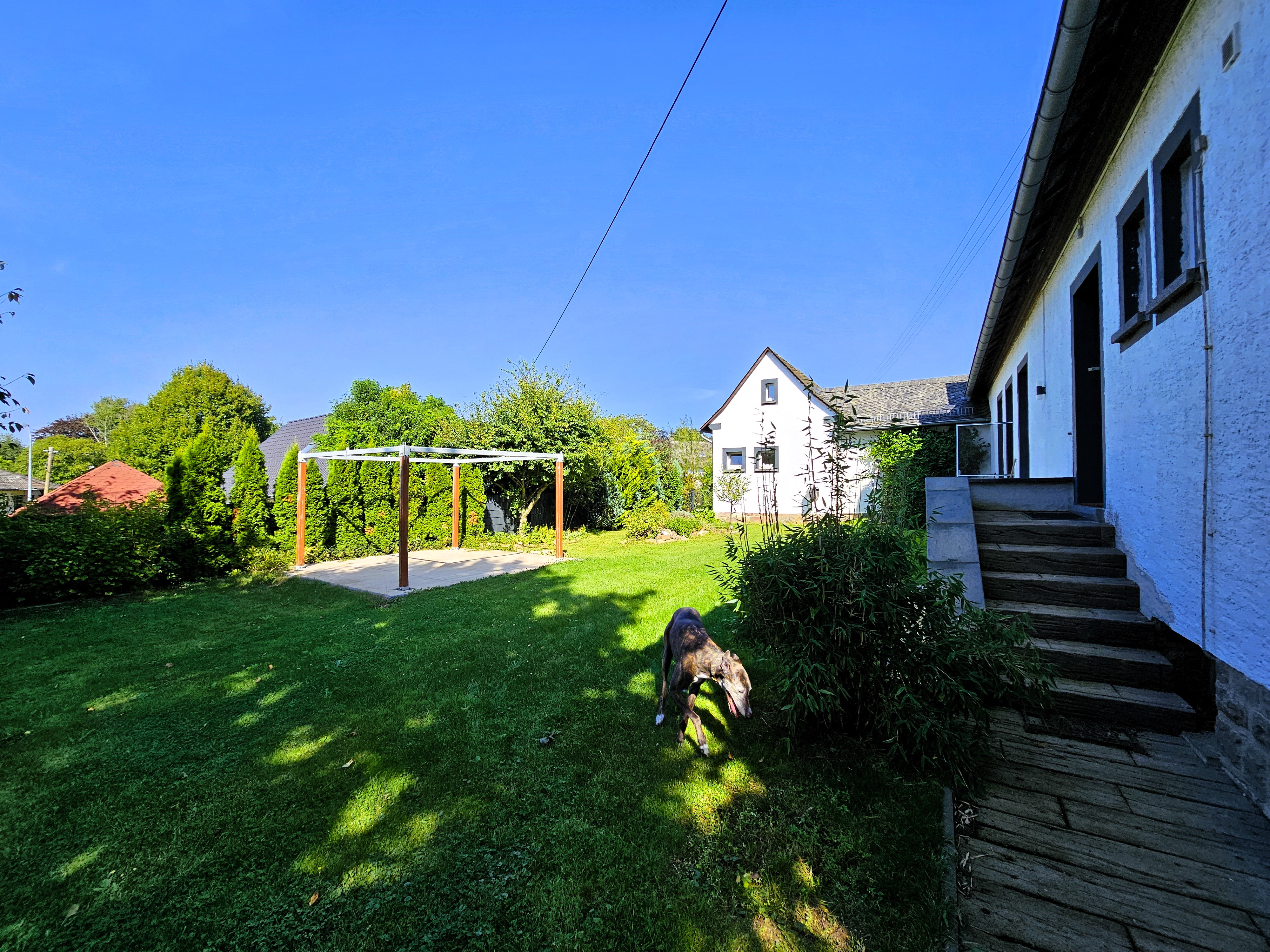 ebenfalls geflieste Terrasse mit vorhandener Pergola in Nordwest-Ausrichtung.