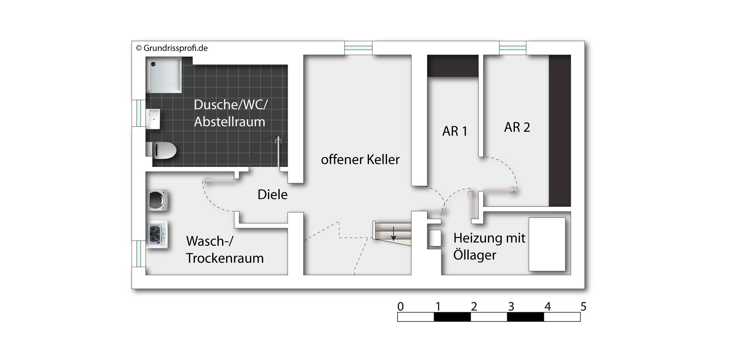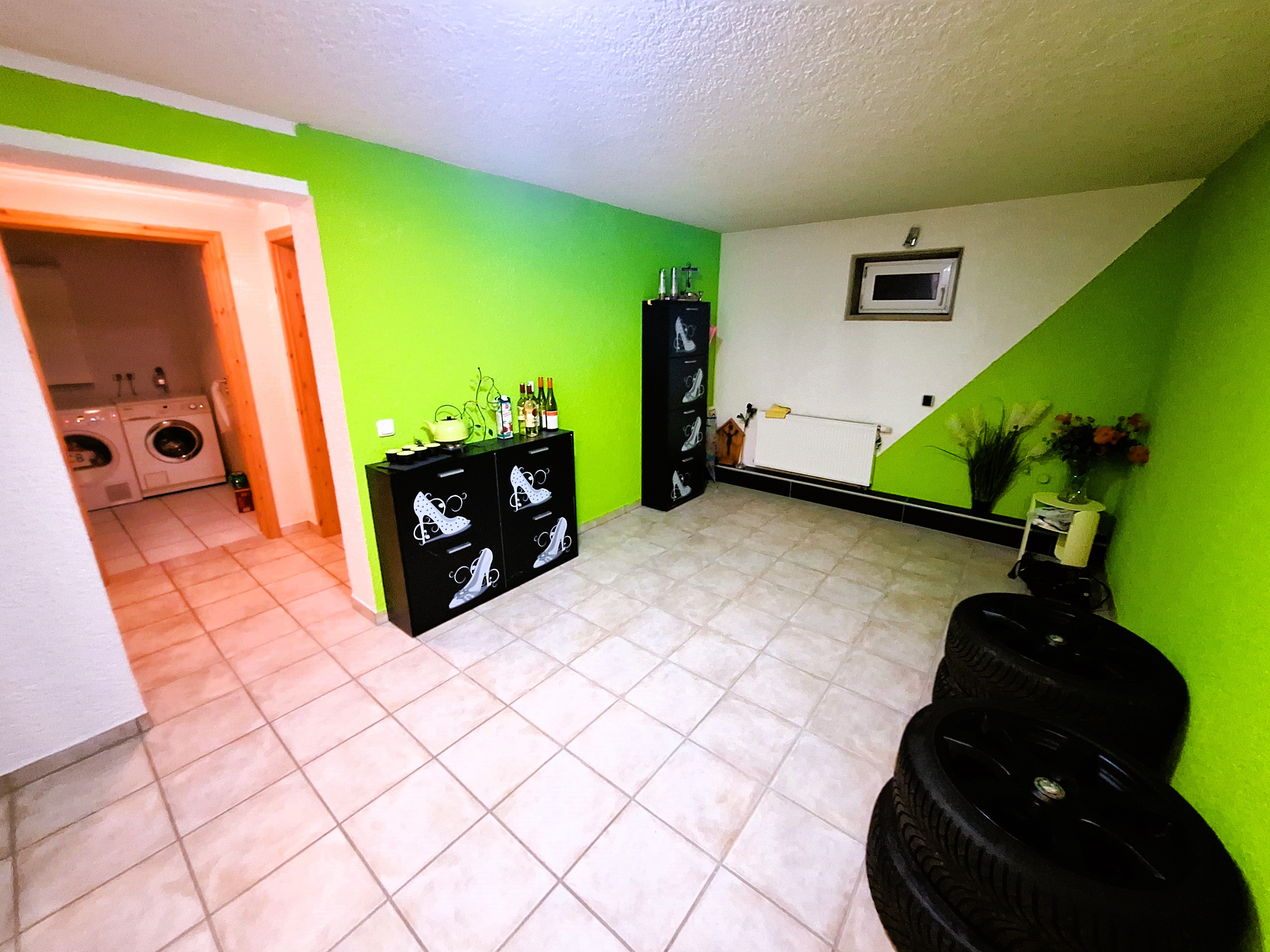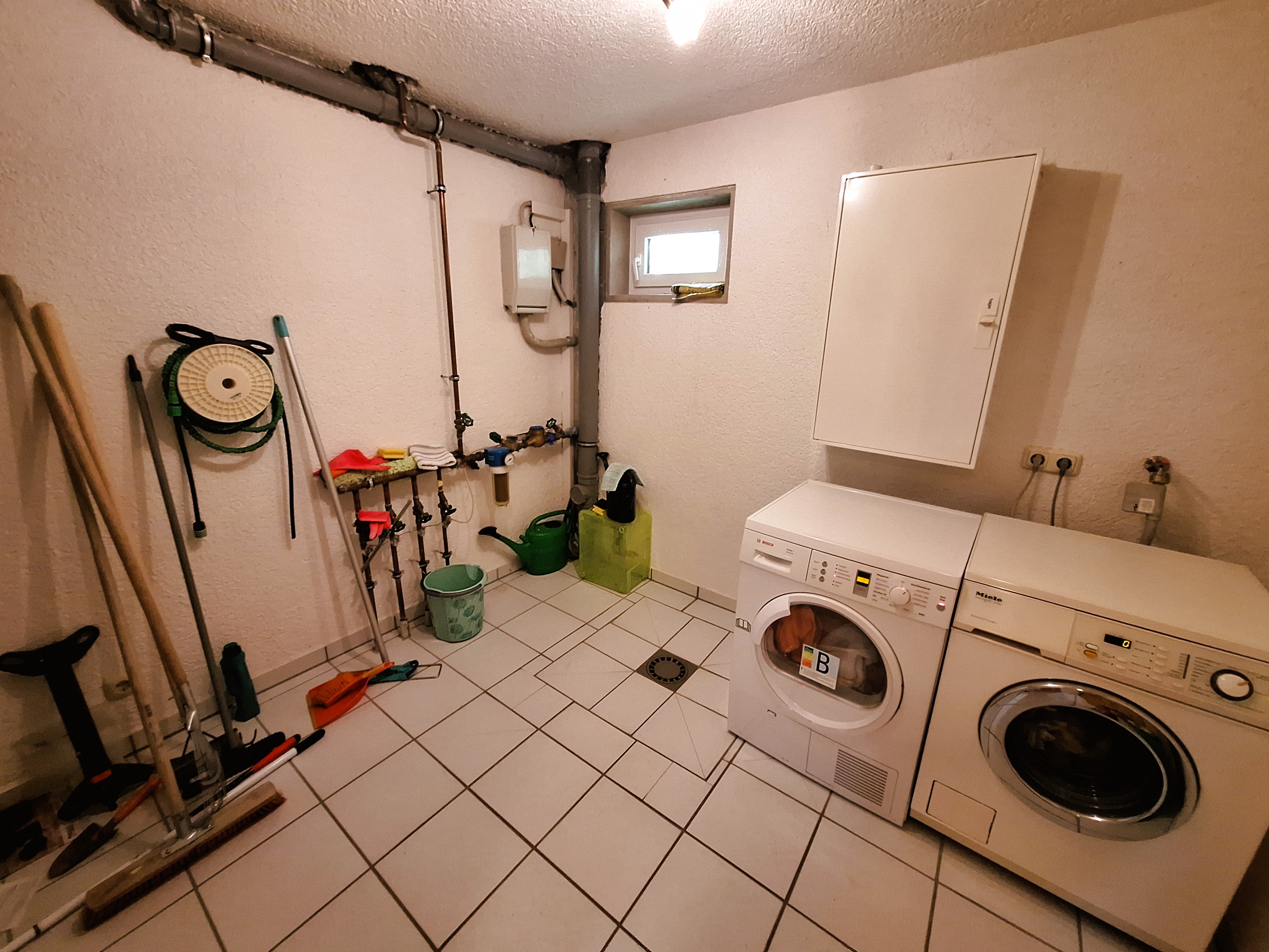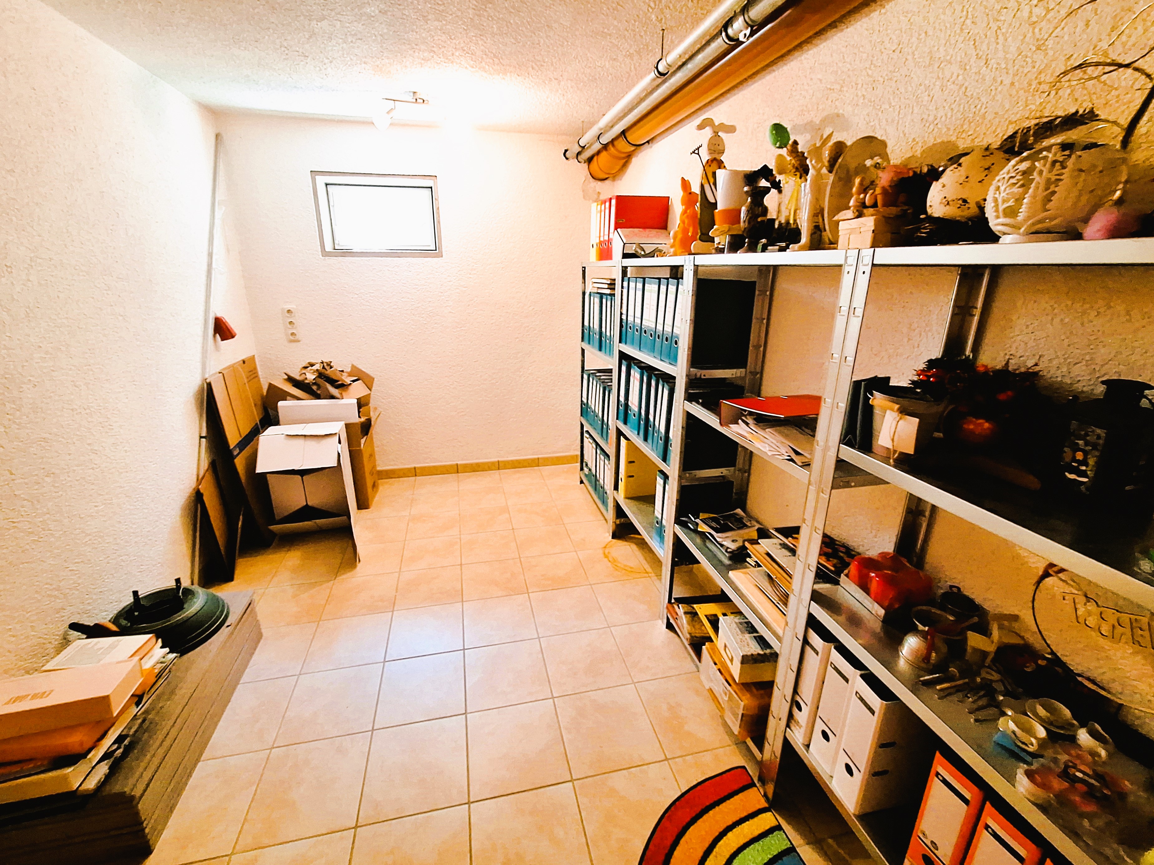 Das Untergeschoss (ca. 57 m²) ist über die innenliegende Treppe zugänglich und verfügt über 6 Räume, die wie folgt aufgeteilt sind: Kellerraum, Abstellraum, Lagerraum, Heizungsraum, Waschraum gefliest und Kellerbad mit Toilette, Dusche und Waschbecken. Der Abstellraum ist mit einem Starkstromanschluß ausgestattet. Hier besteht die Möglichkeit eine Sauna zu integrieren. Insgesamt bietet diese Ebene viel Stauraum und vielfältige Nutzungsmöglichkeiten für die große Familie.