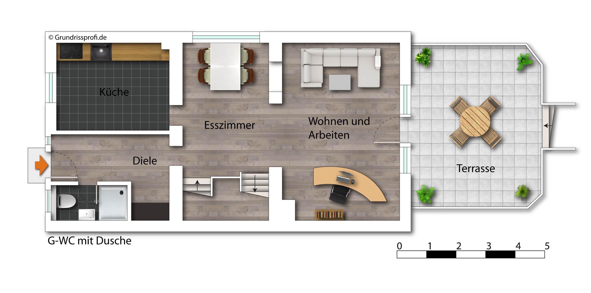 Im Erdgeschoss (ca. 64 m²) erwarten Sie ein helles Wohn-/Esszimmer, eine moderne Küche, ein großes Gäste-WC mit Dusche. Das Büro wurde in den großen Wohnbereich integriert. Der große Flur bietet mit seiner ca. 2 m² großen Nische eine wunderbare Abstellfläche für Jacken, Schuhe oder einen Dielenschrank. Die großen Fenster im Wohnbereich öffnen den Blick in die Ferne und auf die großzügige Terrasse und den Gartenbereich.