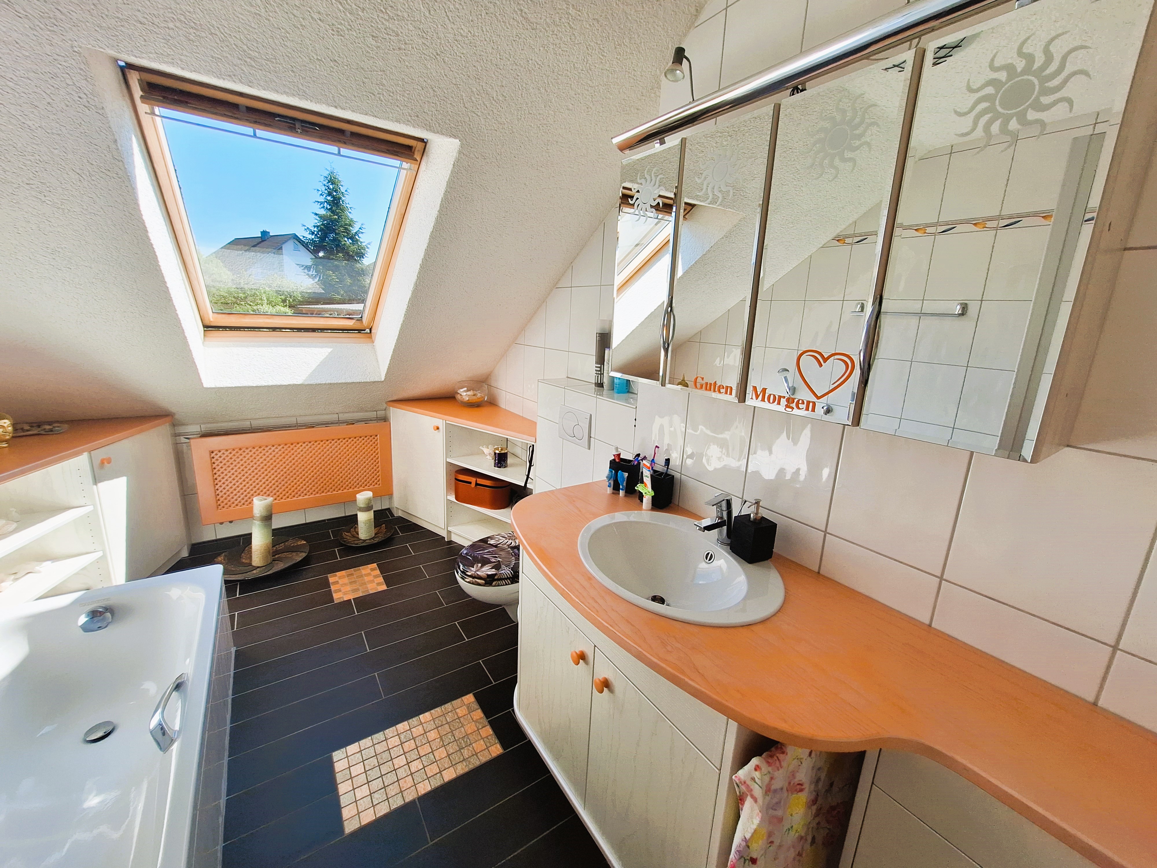 Über die Treppe gelangen Sie in das ca. 53 m² große Obergeschoss Empfangen wird man von einer großen Wohndiele, die durch einen offenen Wohnbereich erweitert wurde. Der offene Wohnbereich kann jederzeit wieder durch eine Wand geschlossen und als Kinderzimmer, Büro oder Gästezimmer genutzt werden. Von diesem Bereich abgehend erschließen sich hier das Elternschlafzimmer, das größere Bad mit Dusche und Wanne sowie ein Kinderzimmer. Hier finden sich 2 geschlossene Räume, derzeit Hauptschlafzimmer und Gästezimmer. Alle Zimmer bieten einen traumhaften Blick ins Grüne.