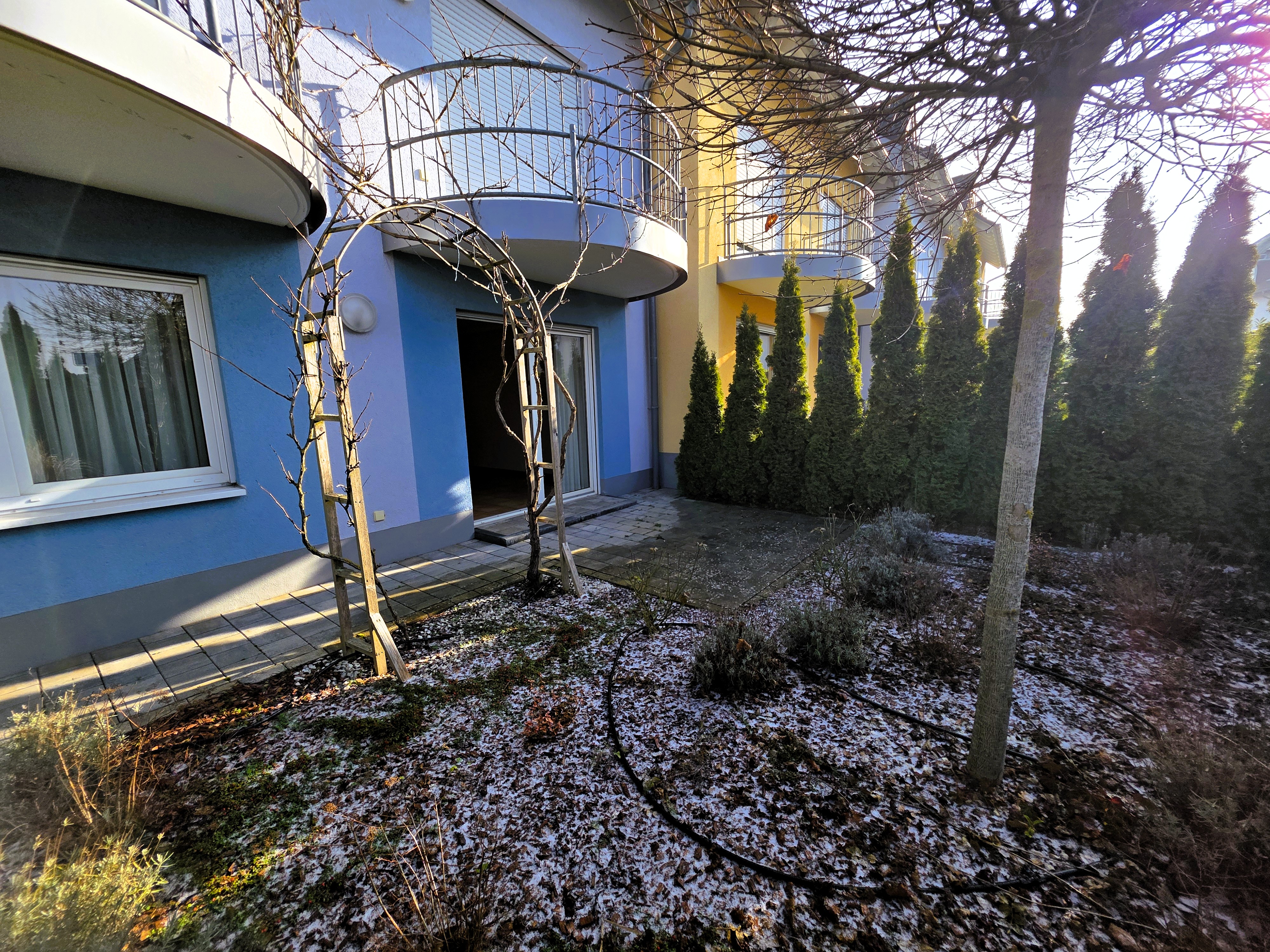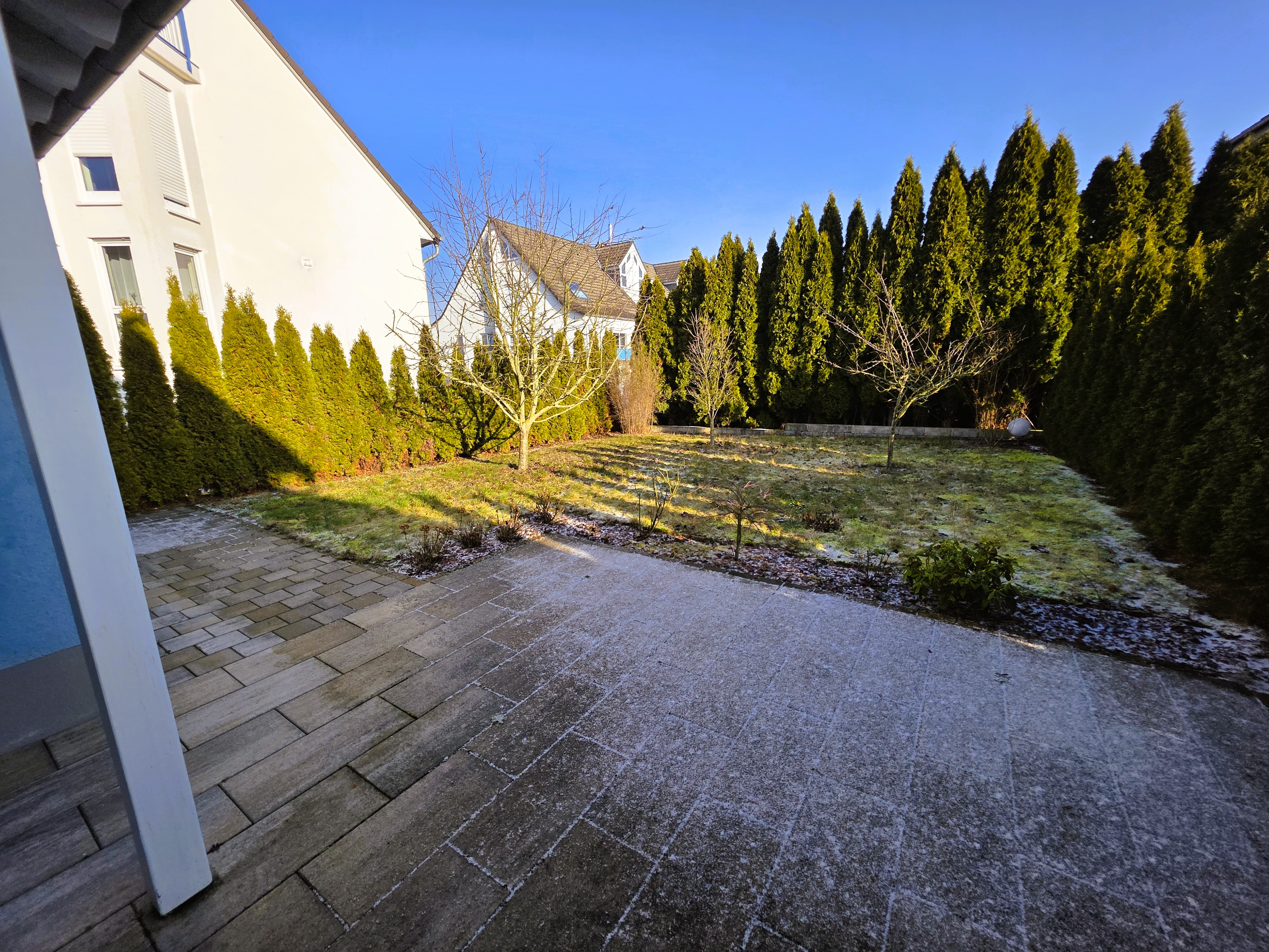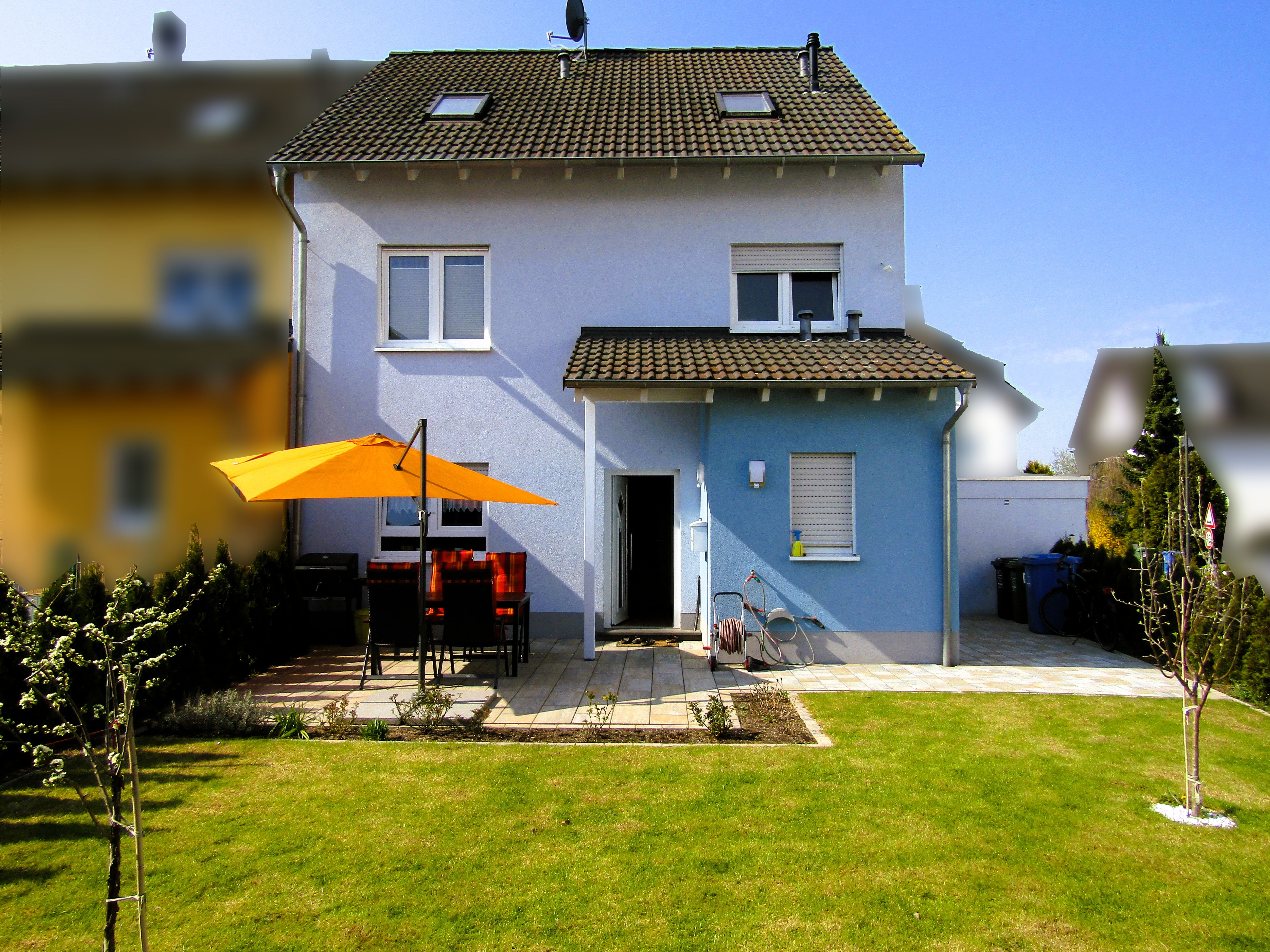Eine sich auf der Rückseite des Hauses befindliche und von der Straße nicht einsehbare Terrasse sowie kleinen Garten, lädt zum Entspannen und Sonnenbaden ein - hier erreichen Sie ebenfalls den Hauseingang.