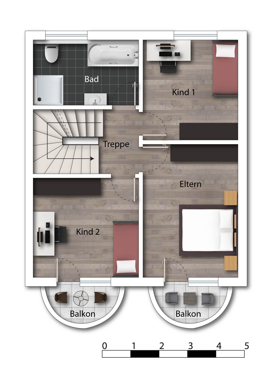 Im Gebäude angekommen, dient eine Diele als Windfang und lässt Sie von hier Küche mit wunderschöner und heller Einbauküche, Wohn-/Esszimmer mit Terrasse und Garten zur Vorderseite, AR, Gäste-WC und das Treppenhaus ins Obergeschoss und Dachgeschoss erschließen. Im Obergeschoss befinden sich folgende Räume: zwei Kinderzimmer, davon eines mit Balkon, ein Elternschlafzimmer mit Balkon und ein Bad mit Badewanne und Dusche sowie das Dachgeschoss mit Heizungs-/Technikraum, zwei kleinere Zimmer, nutzbar als Hobby- bzw. Arbeits- oder Gästezimmer, und ein Bad mit Dusche und Waschmaschinen-/Trockner-Abstellplatz.