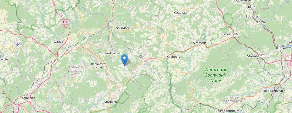 Der nächste, kleinere Bahnhof befindet sich in Traben-Trarbach (12 km), der nächste Flughafen in Frankfurt-Hahn (11 km). Durch den neu erbauten Hoch-Mosel-Übergang ist die verkehrstechnische Anbindung in die Benelux-Staaten garantiert!