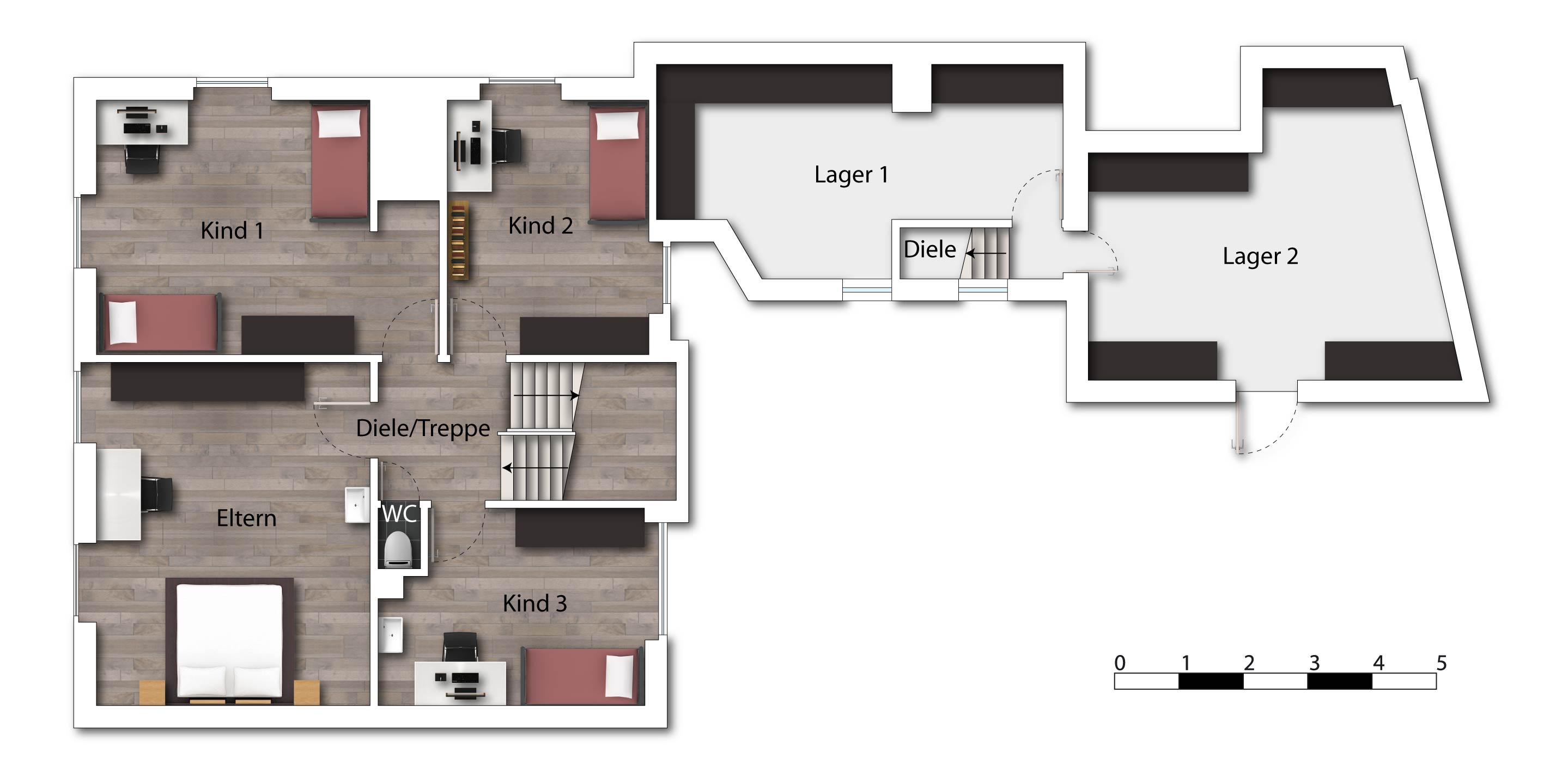 Zum anderen befindet sich im Obergeschoss drei Schlafzimmer, ein kleines WC und der Zugang zum Speicher/Spitzboden (ca. 76 m² Wohnfläche).