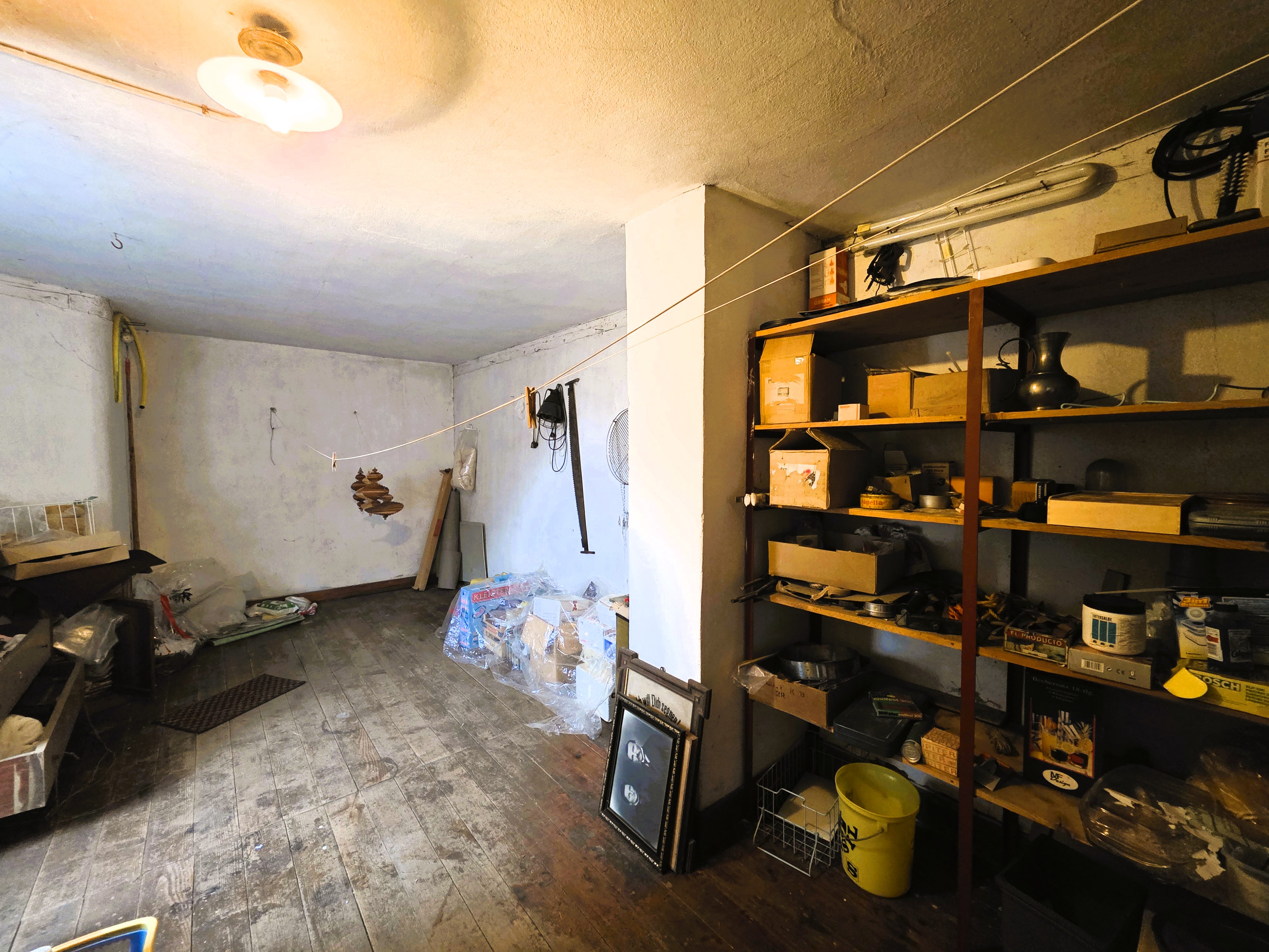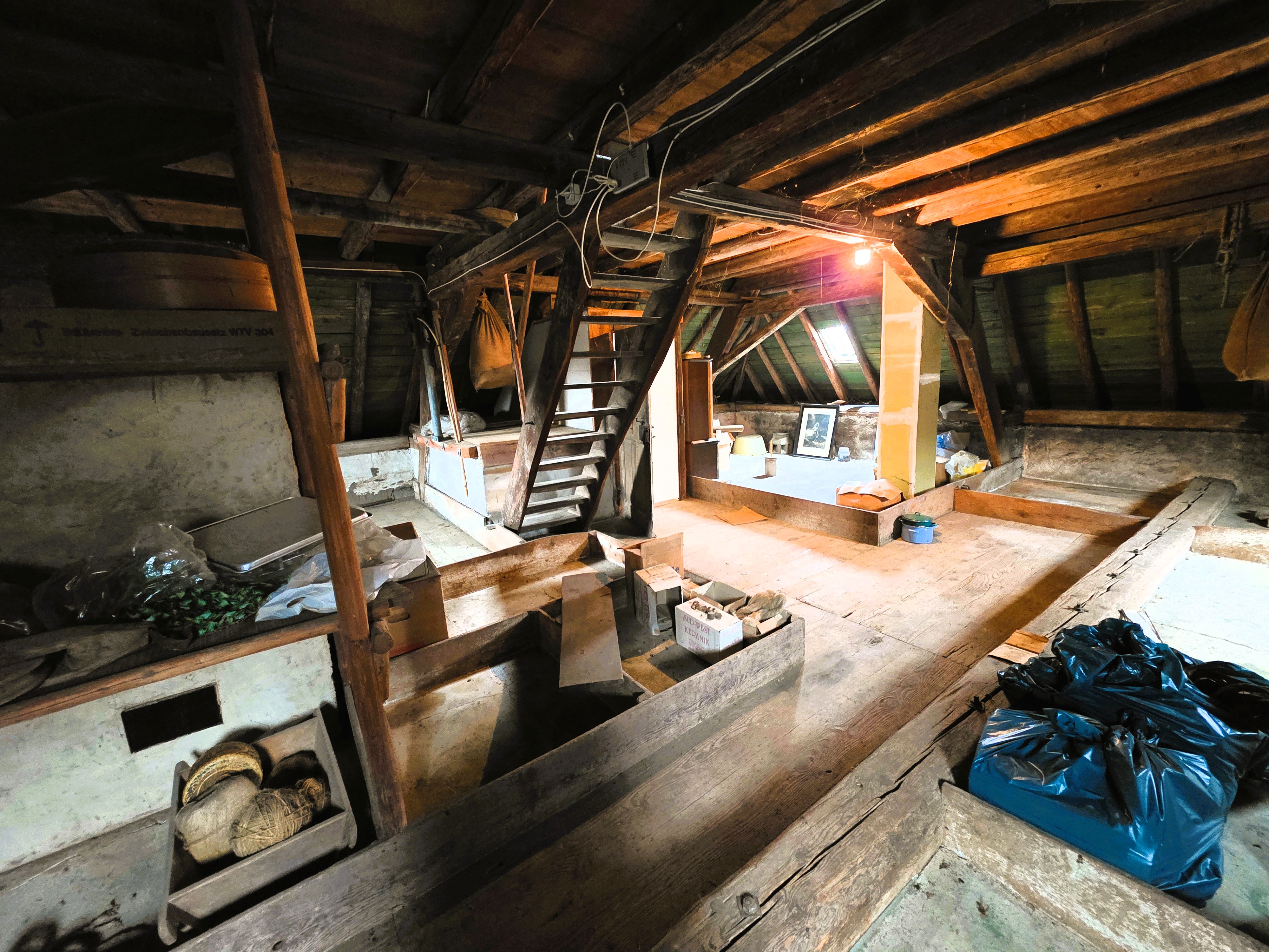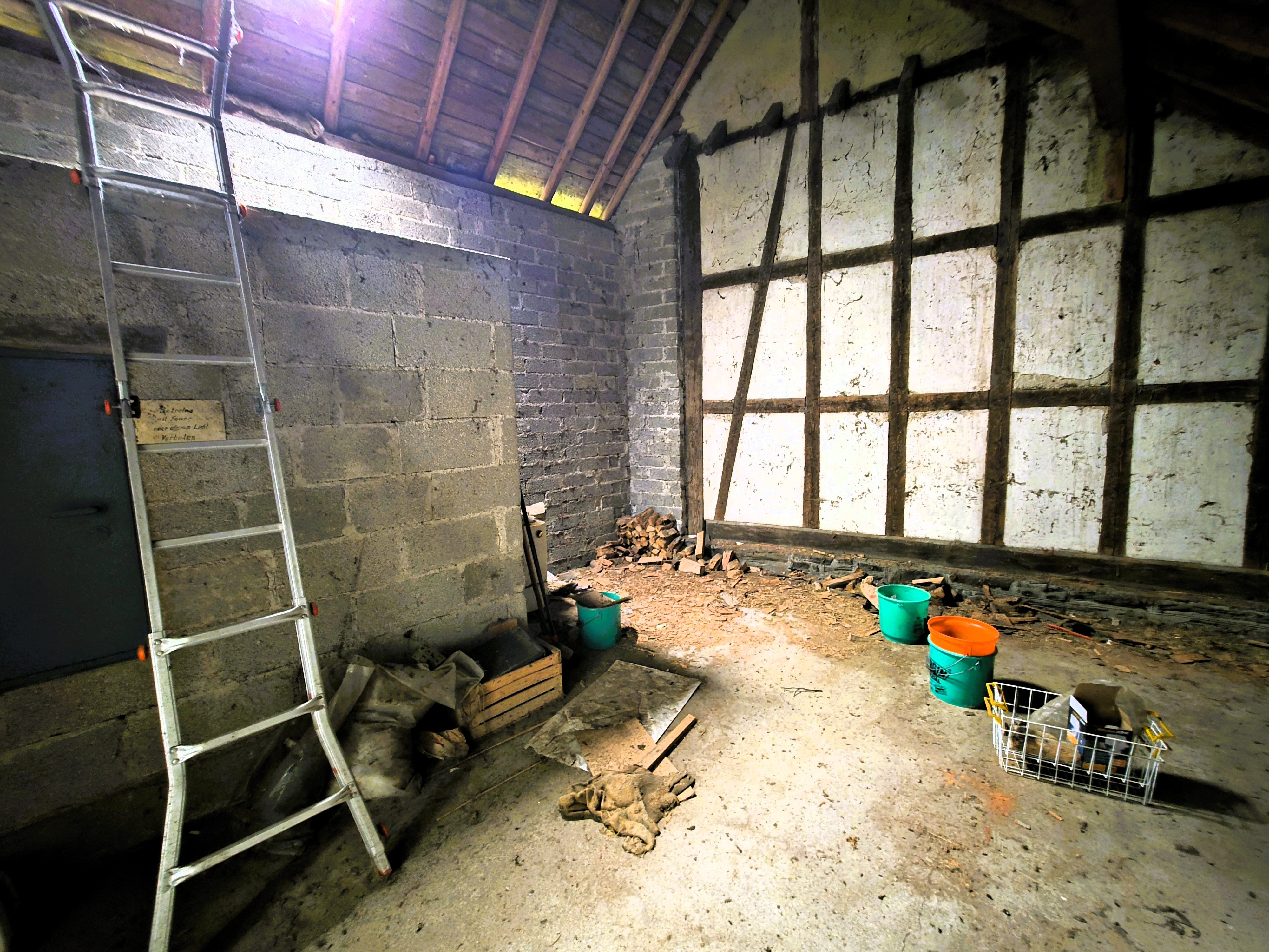 Im Nebengebäude ist neben einer Garage im Erdgeschoss das Holzlager und der ehemalige Schweinestall (?) untergebracht, direkt darüber eine Werkstatt mit entsprechendem Lagerraum. Hier lassen sich Handwerkerträume sehr gut umsetzen.