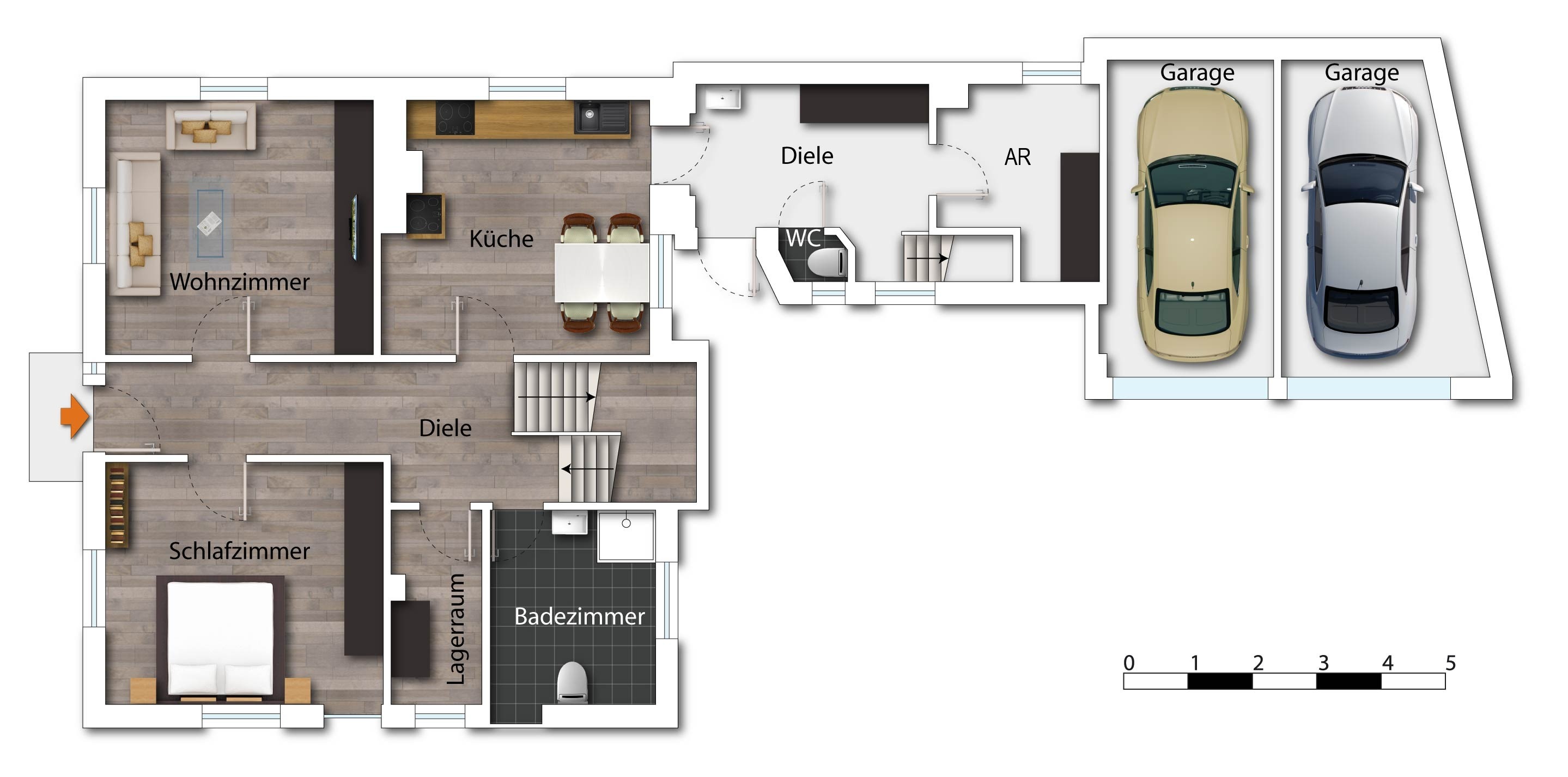 Neben der erweiterten Doppelgarage, wurde die großzüge Scheune mit dahinter liegender Stallung angeordnet, daneben die Milchkammer.