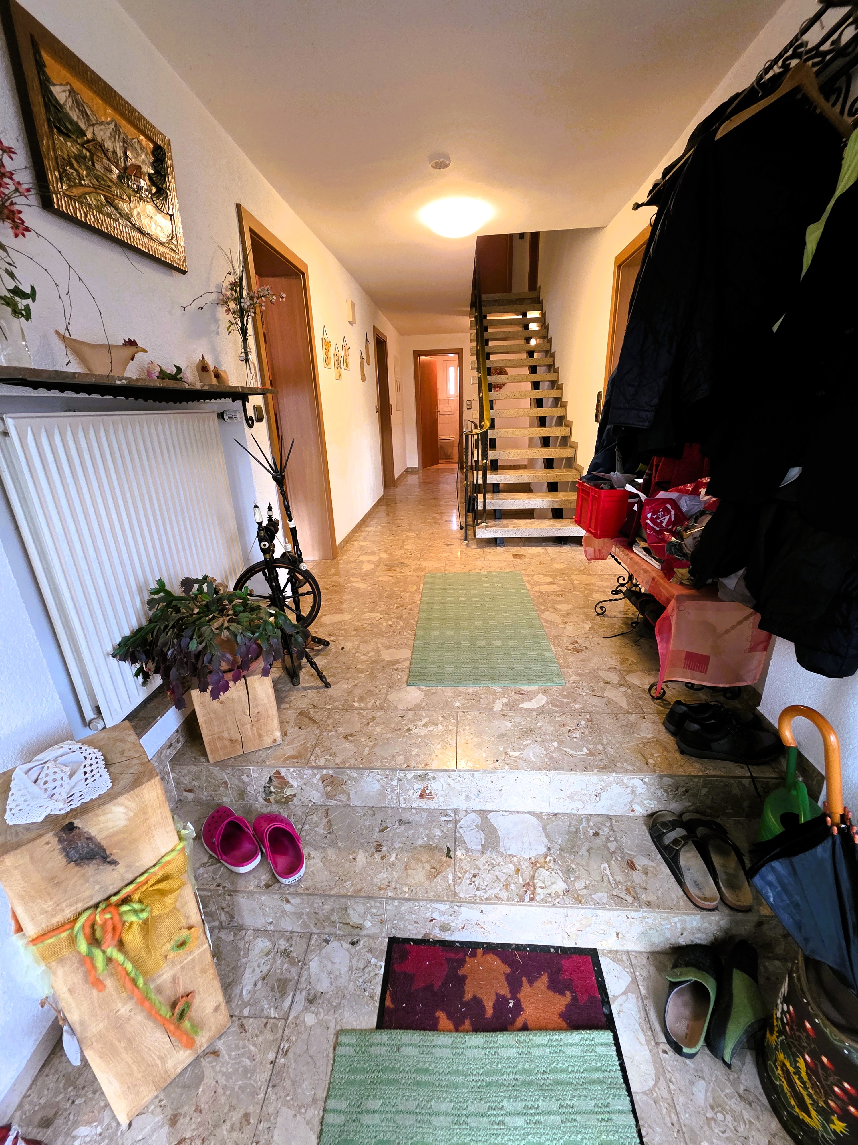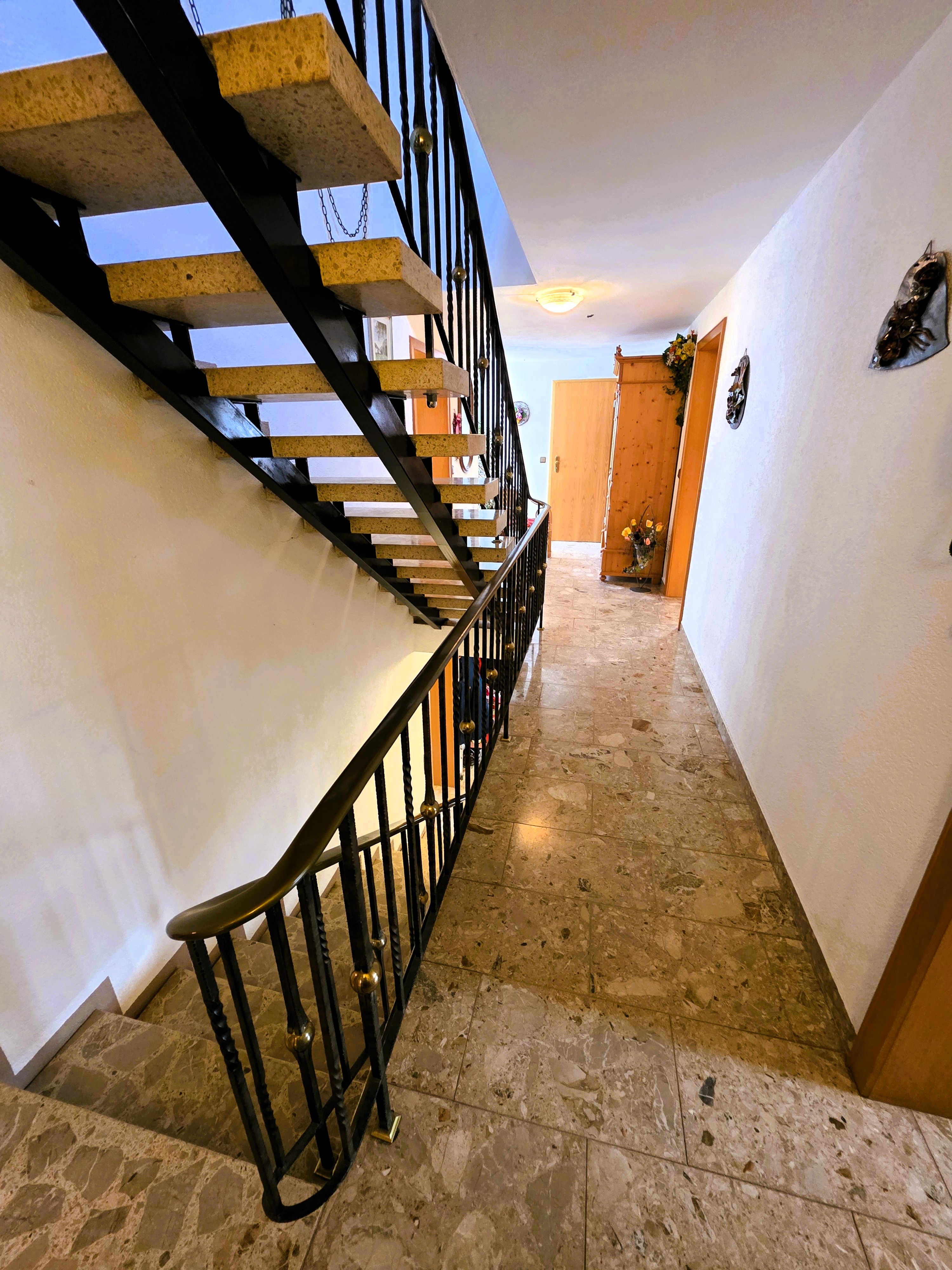 Über ein offenes Treppenhaus gelangen Sie ins Obergeschoss: hier lebte in der Vergangenheit eine eigenständige Familie, wenn auch in einem nicht abgeschlossenen Wohnbereich. Neben einer großzügigen (Wohn-) Küche und Wohnzimmer (mit Balkon), die ebenfalls zu Schlafzimmern umfunktioniert werden könnten, liegen auf dieser Ebene zwei weitere Schlafzimmer, ein Abstellraum und ein kleineres Tageslicht-Bad mit Dusche und Pissoir (OG Wohnfläche ca. 89 m²).