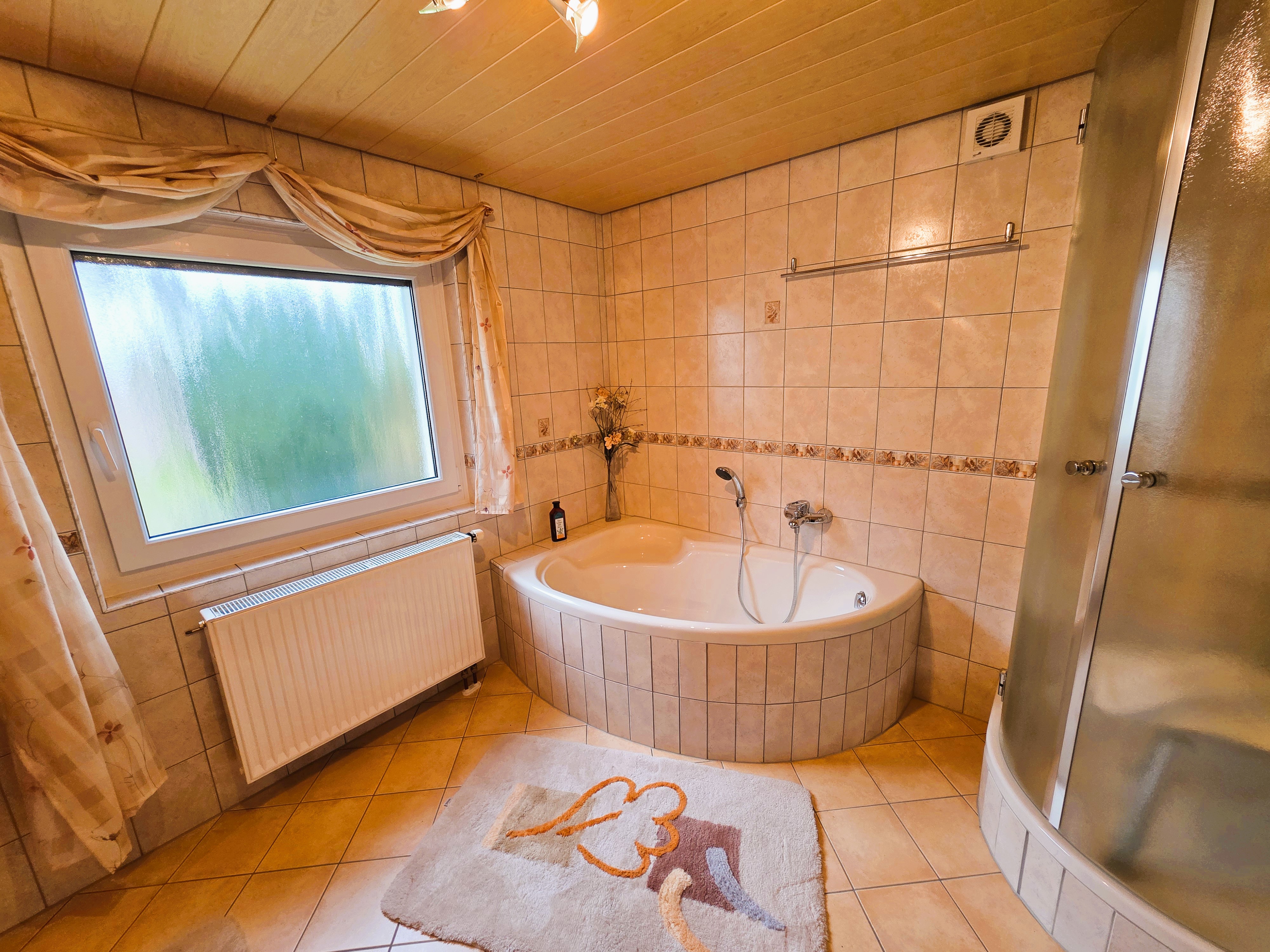 Die Räume sind mit Fliesen, Parkett, Teppich und PVC ausgestattet.