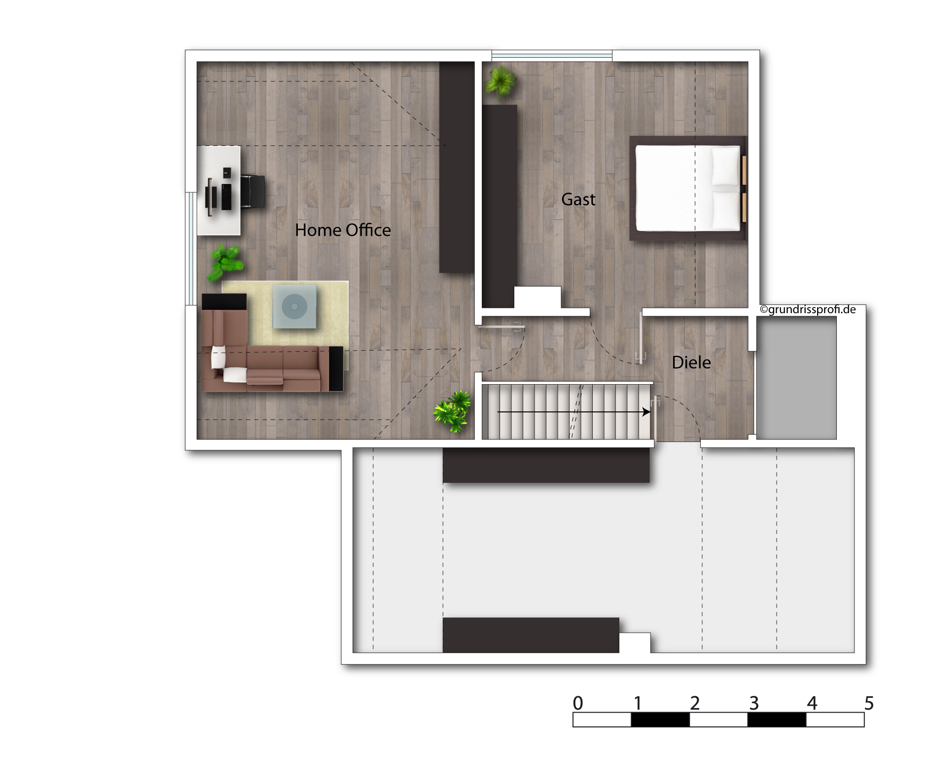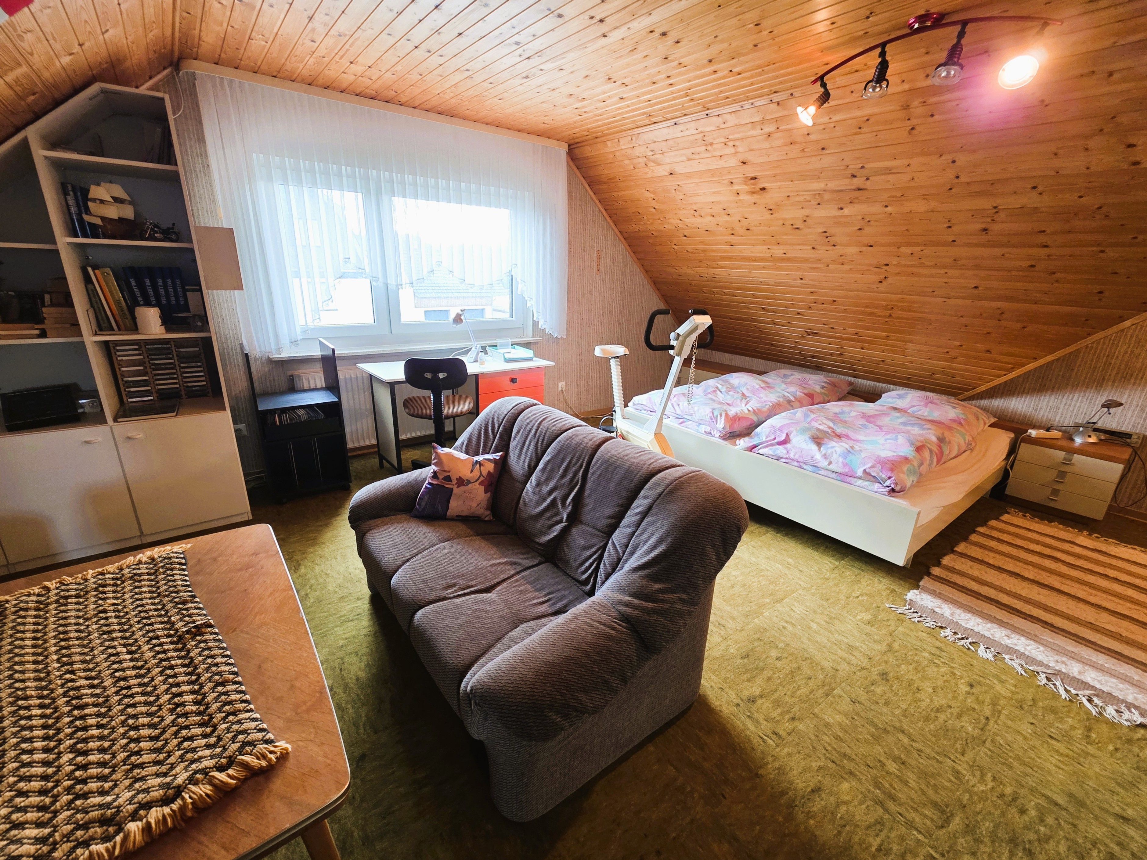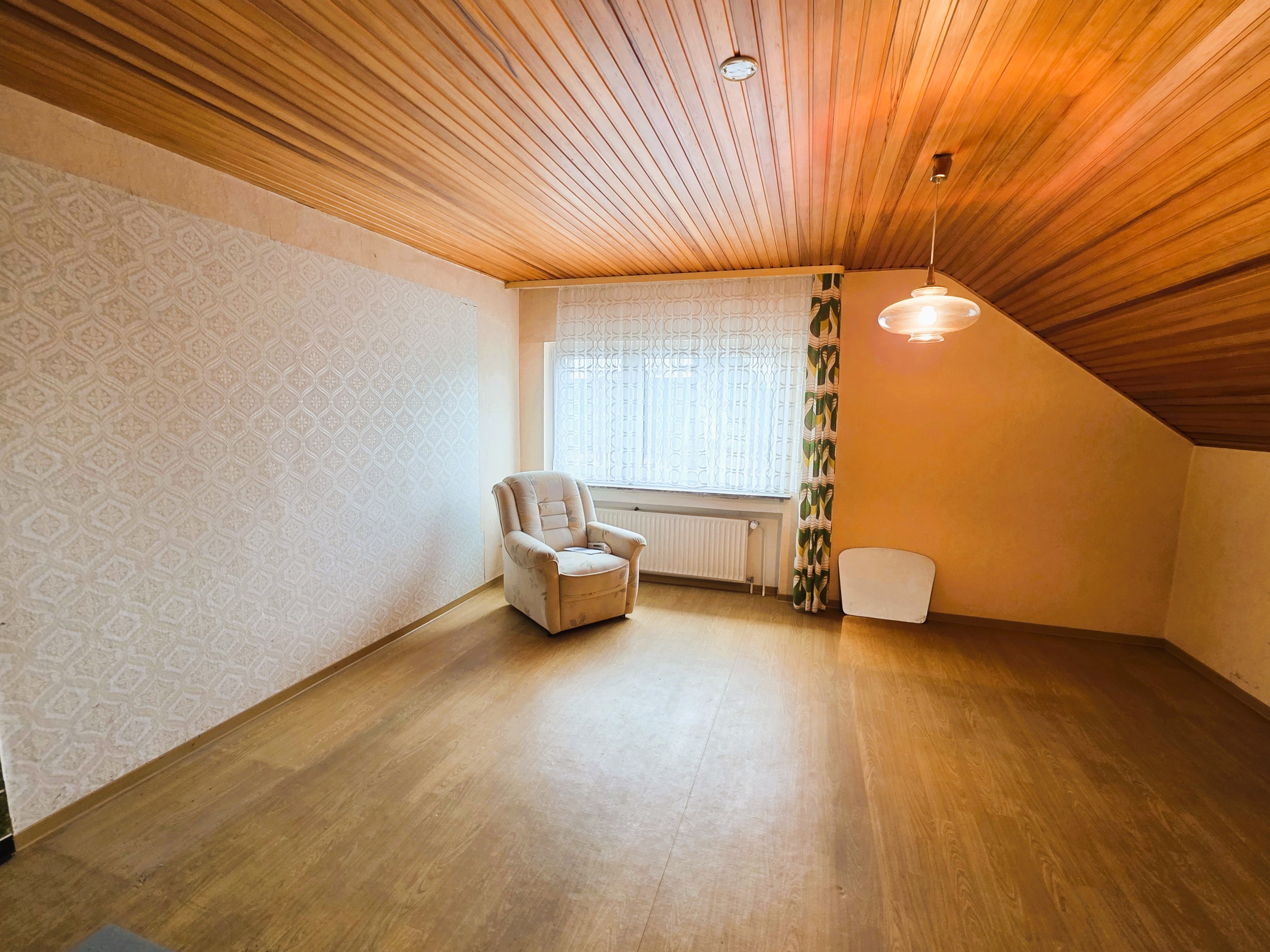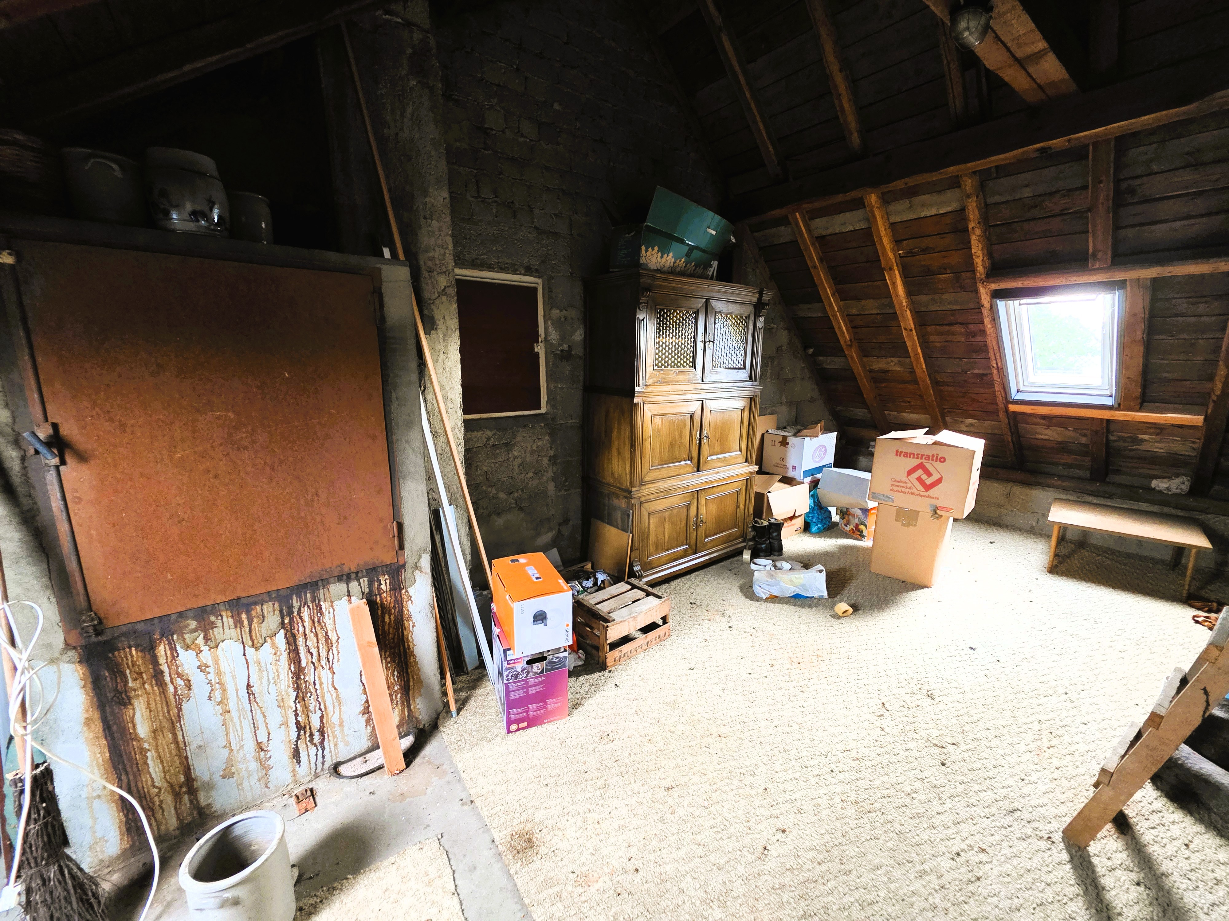 Im Dachgeschoss angekommen, liegen hier zwei weitere große Räume nebeneinander, die zu Wohnzwecken ausgebaut wurden; daneben ein nicht ausgebauter Speicherraum.