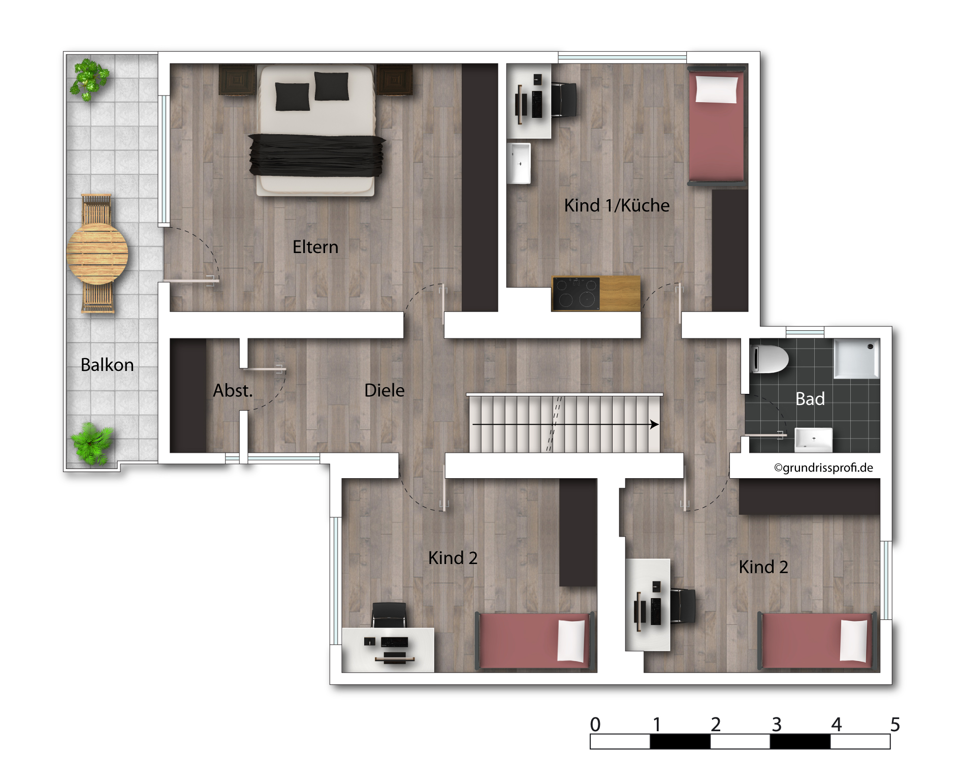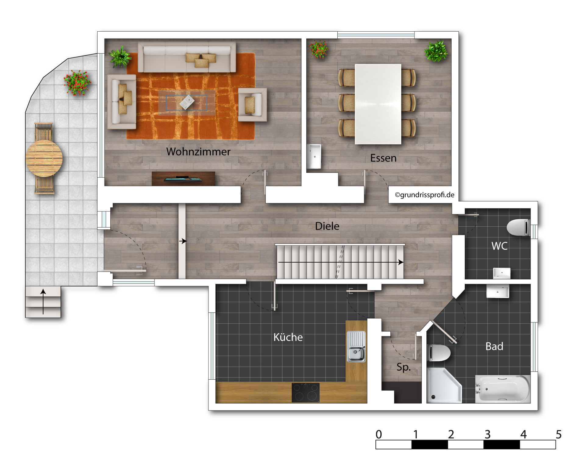 Im Erdgeschoss befinden sich neben (Wohn-) Küche incl. Einbauküche und dahinter liegender Abstellkammer, Esszimmer, Wohnzimmer, Tageslicht-Bad mit Dusche und Badewanne, Gäste-WC, auch eine Terrasse mit einer Grundfläche von ca. 8 m² (EG Wohnfläche ca. 90 m²) .
